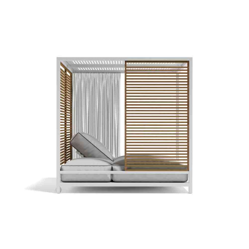 Konstrukcja z aluminium malowanego proszkowo w kolorze białym lub grafitowym. Ściany przeciwsłoneczne z naturalnego drewna tekowego. Rozkładane poduszki wykonane z oddychających mikrosfer polistyrenowych pokrytych tkaninami zewnętrznymi, zdejmowane i nadające się do prania.