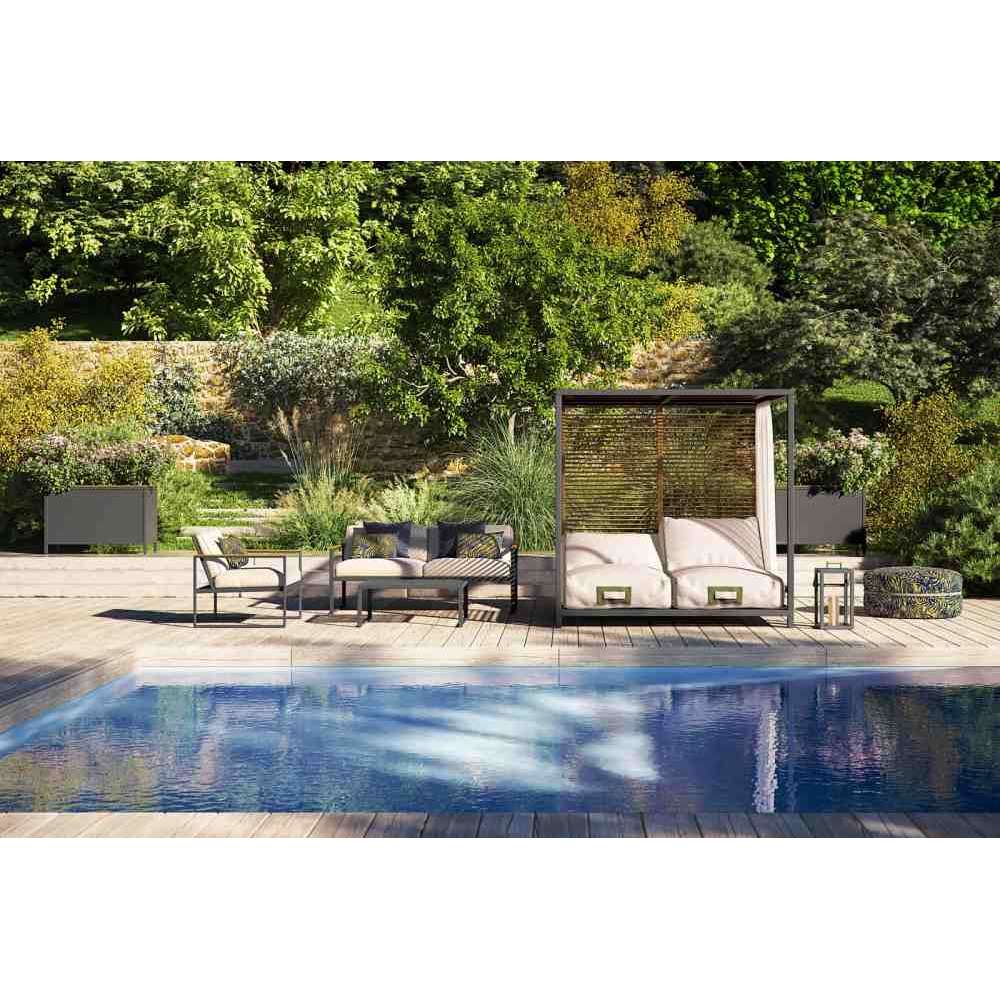 Atmosphera, Alcova, Meble ogrodowe, Łóżka ogrodowe, łóżko ogrodowe, Łóżka ogrodowe w stylu współczesnym, Łóżka ogrodowe z tkaniny, Łóżka ogrodowe z aluminium, Łóżka metalowe z powłoką proszkową, Łóżka ogrodowe z powłoką proszkową, Łóżka ogrodowe z baldachimem, Łóżka ogrodowe z leżakami