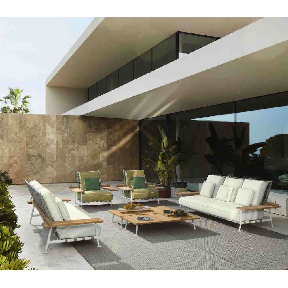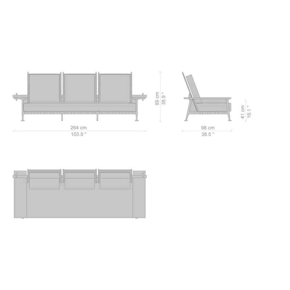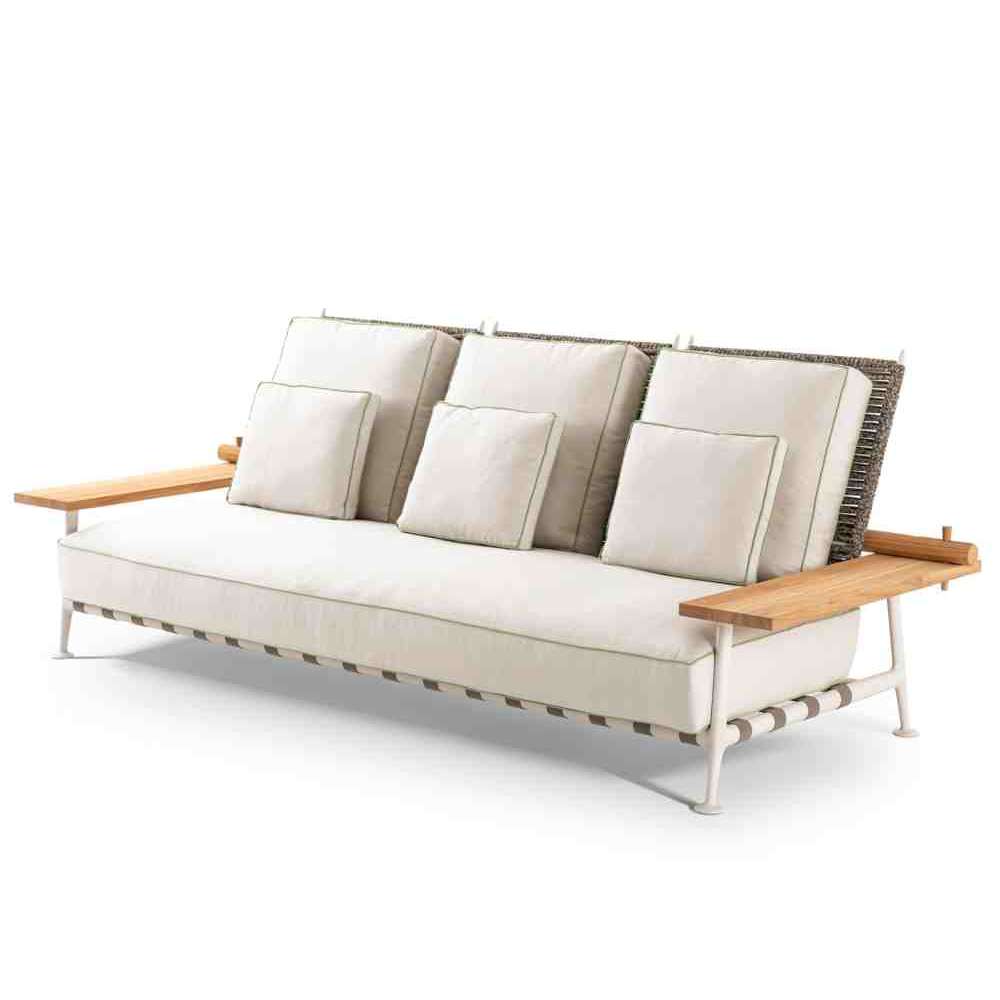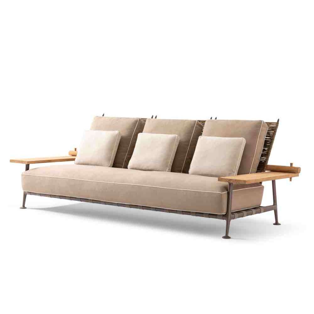 Dwu- lub trzyosobowa sofa Fenc-e Nature ma organiczne formy - takie jak odlewana aluminiowa podstawa - i elementy strukturalne, które celebrują jej powinowactwo z otoczeniem, takie jak naturalnie wyglądający podłokietnik z litego drewna tekowego z piaskowanym wykończeniem. Każde oparcie, z ramą z malowanej stali nierdzewnej AISI 304, jest dostępne z ręcznie plecionej liny o ekskluzywnym wzornictwie lub z naturalnej, niepoddanej obróbce wierzby, użytej tutaj po raz pierwszy. Wyjątkowy komfort sofy gwarantują obszerne poduszki siedziska i oparcia z wyściółką SoloSoff©, produkt na bazie dmuchanego włókna poliestrowego i pianki zapamiętującej kształt, oraz odchylane oparcie, które można ustawić w dwóch różnych pozycjach dzięki ręcznemu mechanizmowi inspirowanemu przez architekturę azjatycką: pręt nośny z litego drewna tekowego, obrobiony tak, aby wyglądał jak gałąź, przytrzymywany dwoma drewnianymi gwoździami.