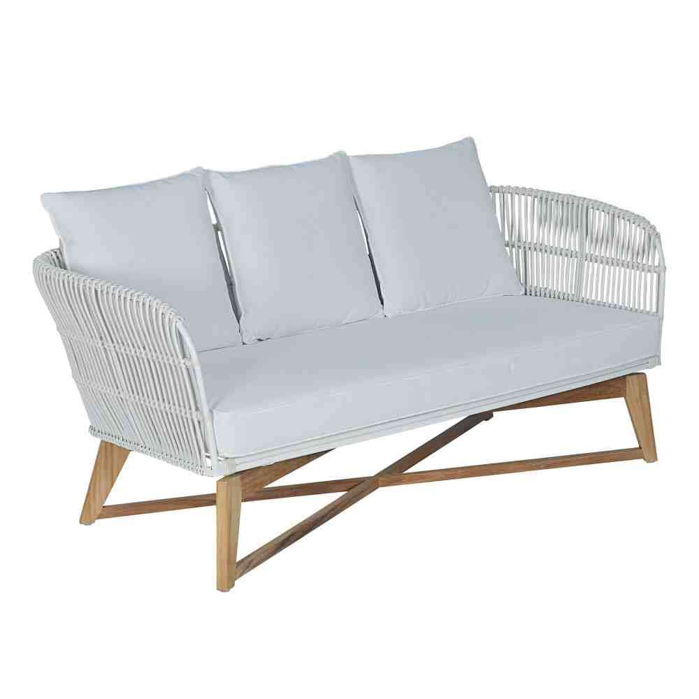 Bromo to sofa z aluminiową ramą malowaną proszkowo farbą epoksydową. Nogi z trzciny syntetycznej i drewna tekowego.