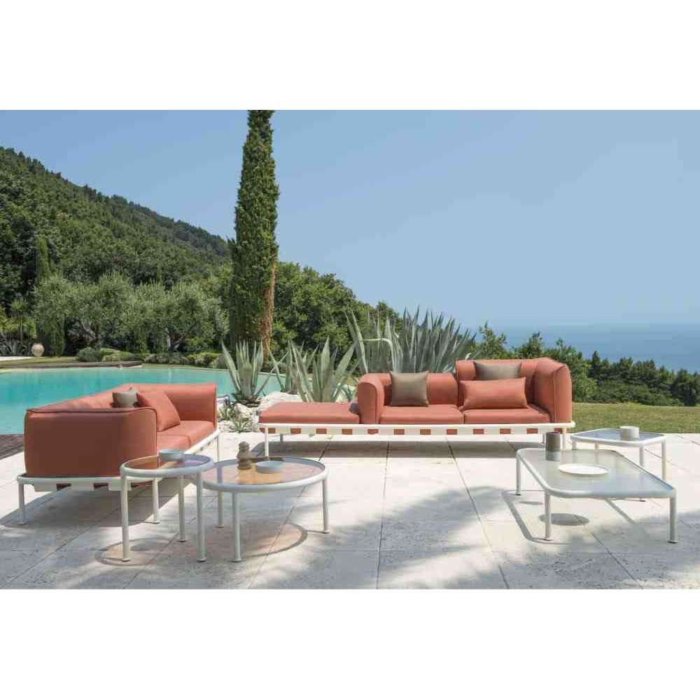 Dock to modułowy system sof; jego różne elementy składowe są niezwykle łatwe w montażu i zapewniają szeroką gamę kombinacji, od leżanek po sofy o różnych rozmiarach. Rama wykonana jest z aluminium, a poduszki z gumy piankowej pokrytej tkaniną zewnętrzną Ferrarì batyline, lekkim i elastycznym materiałem, łatwym do czyszczenia i odpornym na czynniki atmosferyczne.