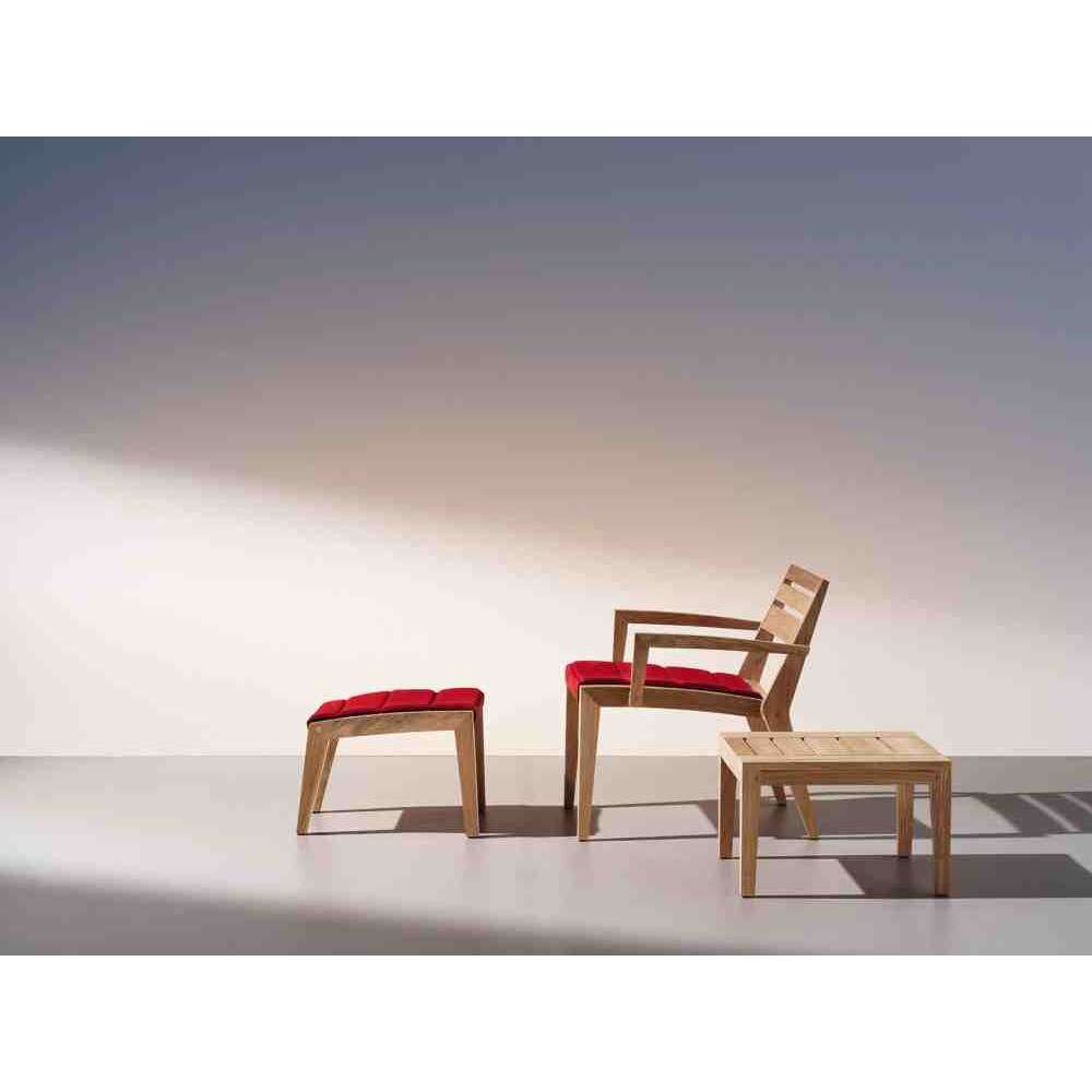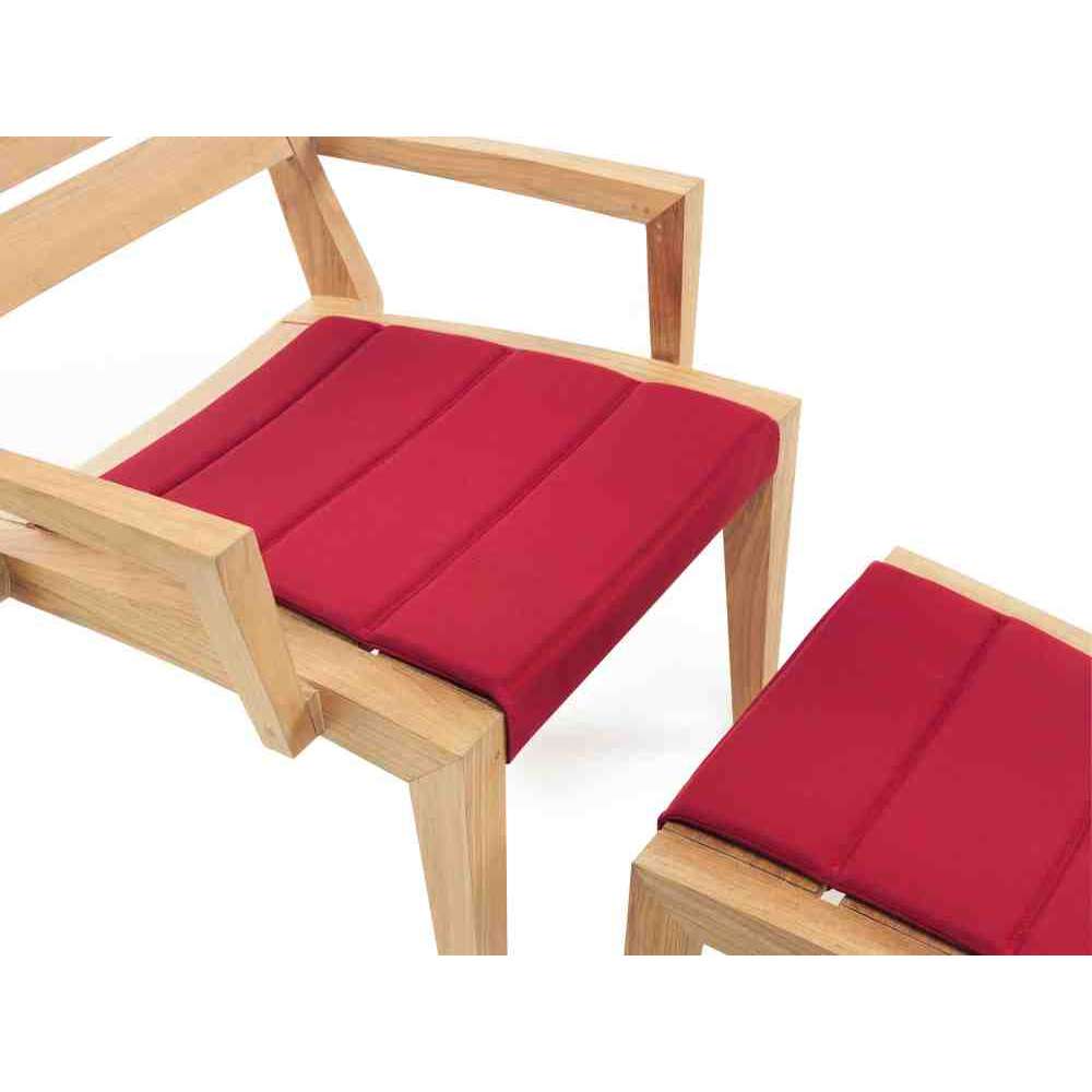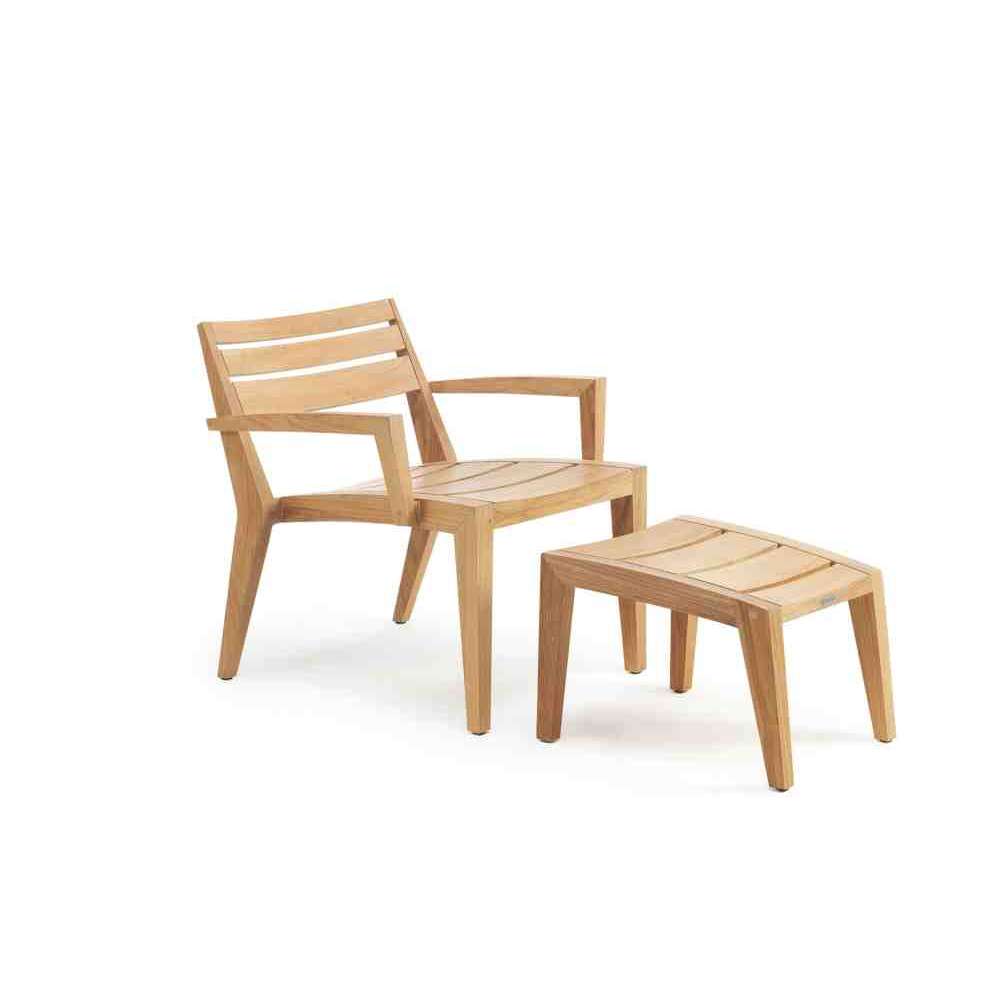 Zdejmowany podnóżek z drewna tekowego uzupełnia fotel Ribot, zamieniając go w relaksujący szezlong.