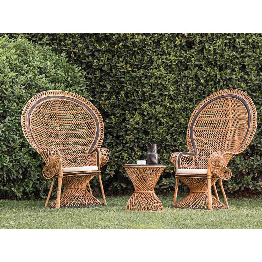 Wykonany z ręcznie tkanego naturalnego rattanu z półbłyszczącym wykończeniem w naturalnym kolorze i czarnymi detalami. Okazjonalne i niskie stoliki z tkanym wiklinowym blatem i szklanym blatem. Stopki teflonowe. Linia obejmuje niskie okrągłe stoliki z perforowaną podstawą oraz fotel z obszernym zaokrąglonym oparciem w pawie: reinterpretacja słynnego „Krzesła Pawia”, wykończonego w kolorze czarnym. Nadaje się do zadaszonych przestrzeni zewnętrznych.