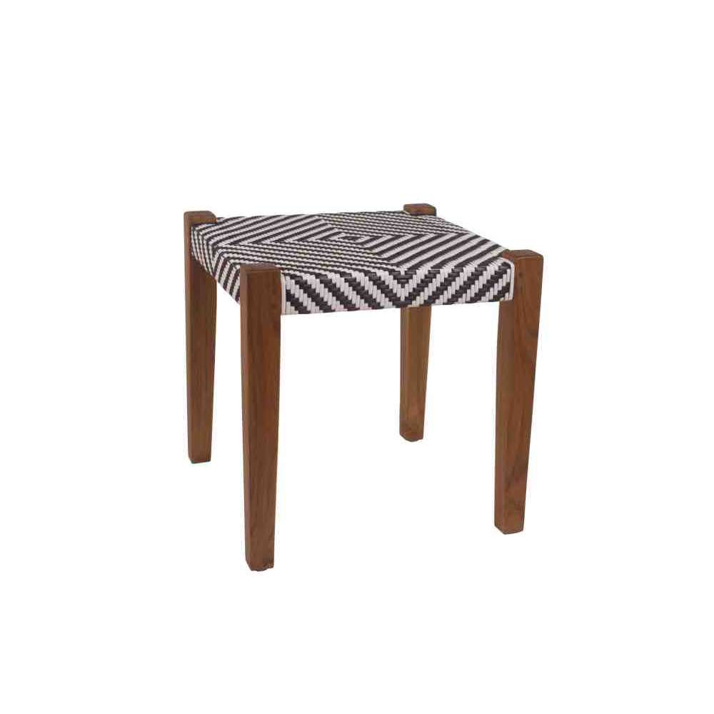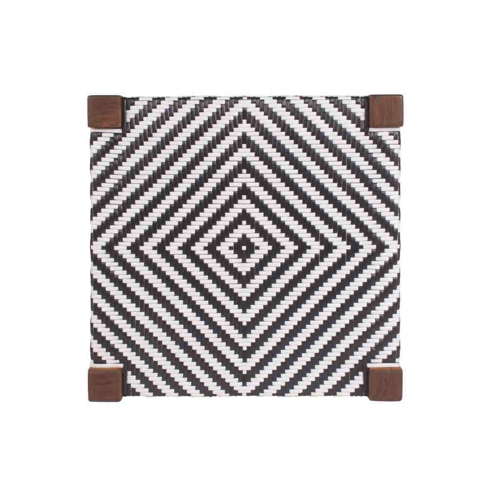 Stoły i krzesła wykonane są z drewna tekowego i tkanego syntetycznego rattanu w dwóch kolorach: dekorację stanowi w rzeczywistości naprzemienność czerni i bieli. Poduszki pufy posiadają dwa różne rodzaje obicia: styropian, który sprawia, że poduszka modeluje się do naszego kształtu podczas siedzenia, lub z pianki ekologicznej, ponieważ uzyskanej z lamówek pozostałych po obróbce pianki poliuretanowej: miękkiego i wygodnego materiału ekologicznego .