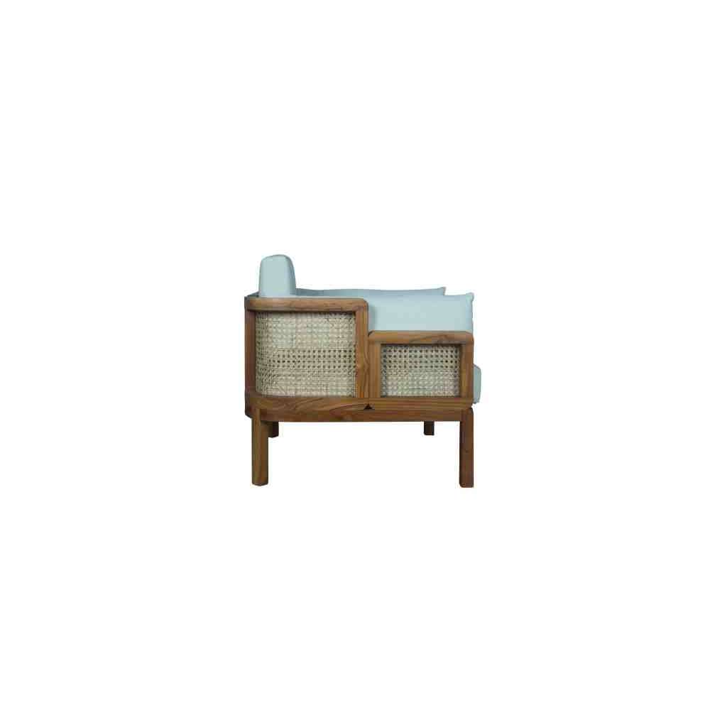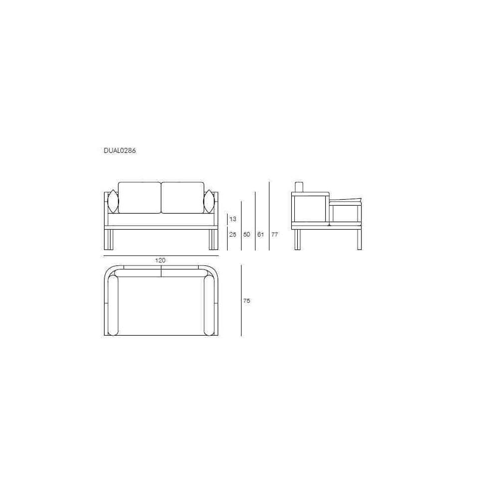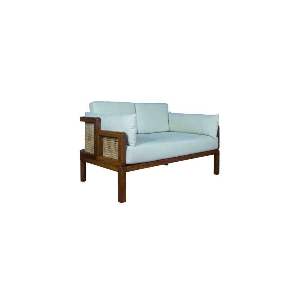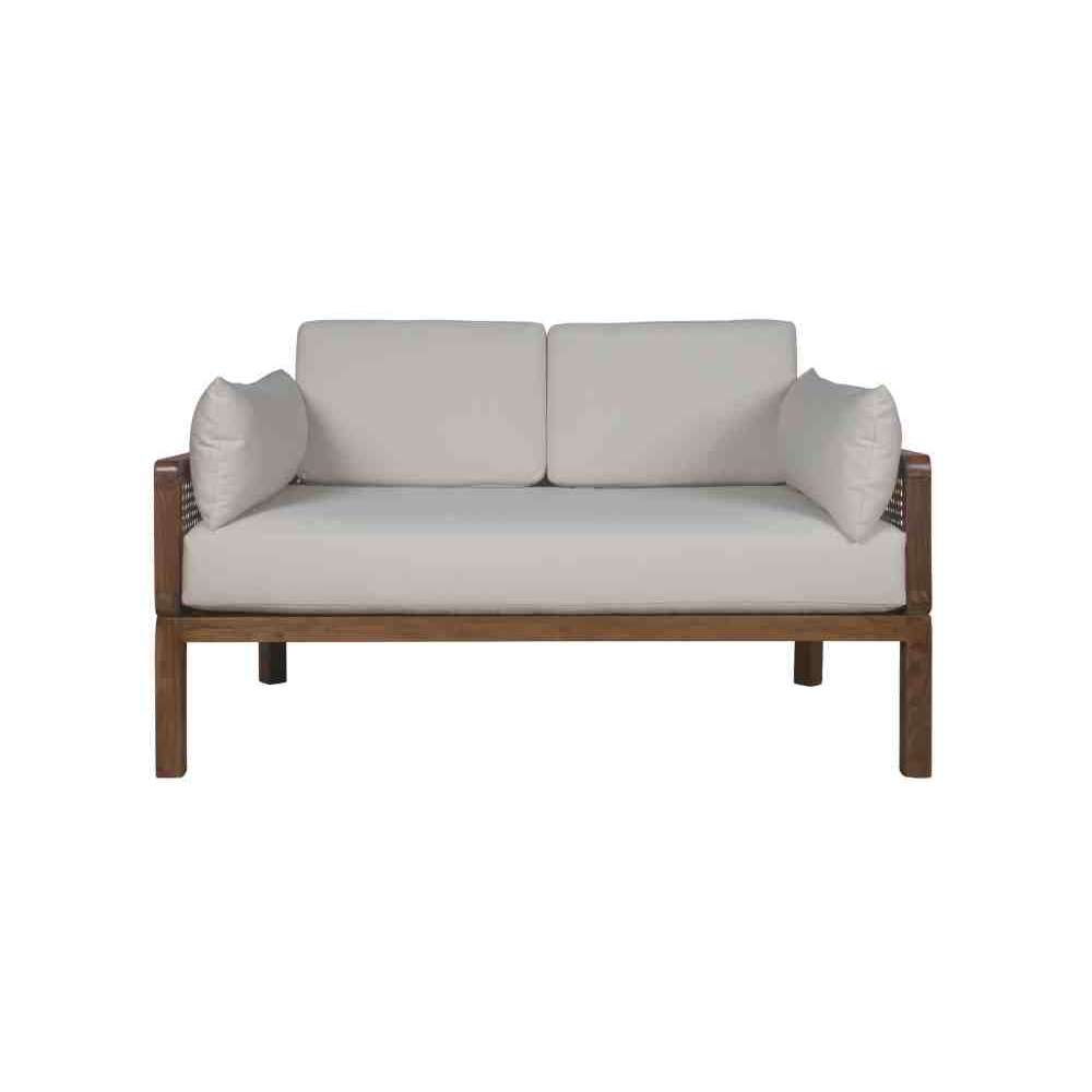 Dwuosobowa sofa z kolekcji Dual, z zaokrąglonym tylnym siedzeniem z wiedeńskiej słomy, naturalnego rattanu i struktury drewna tekowego. Linia ta charakteryzuje się „dwoistością” pomiędzy szlachetnie polerowanym drewnem i szorstkim naturalnym rattanem, w jednym meblu, łączącym wygodę i piękno.