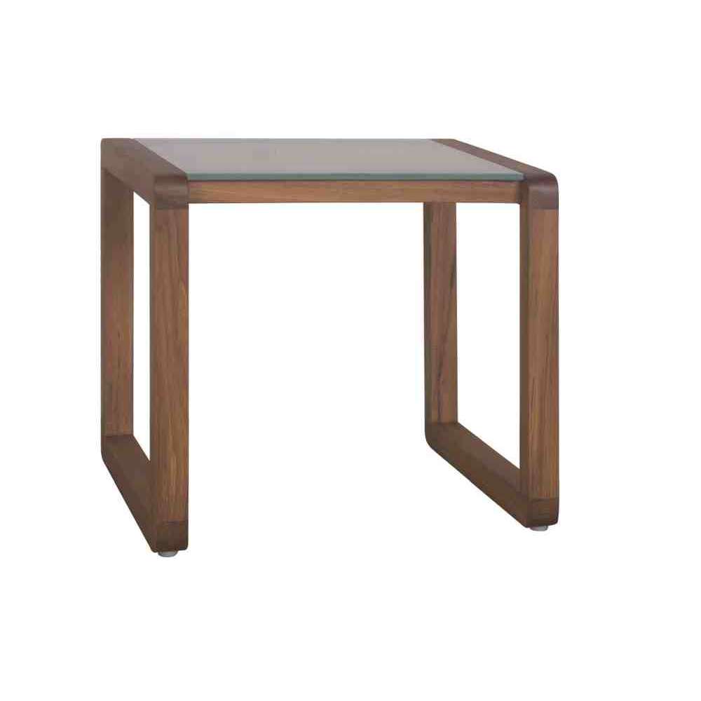 Kwadratowy stolik kawowy z blatem z matowego szkła i konstrukcją z drewna tekowego. Cechą tego stolika kawowego są nogi, które łączą się ze sobą, tworząc idealny kwadrat.