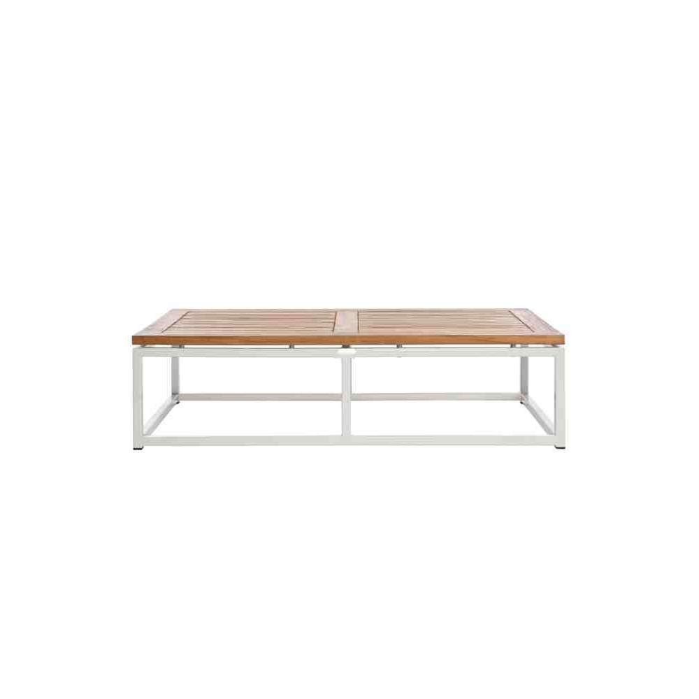 Stoły Lui & Lei wykonane są z malowanego proszkowo aluminium i drewna teakowego, dzięki czemu nadają się do użytku na zewnątrz. Jego projekt jest minimalistyczny i ponadczasowy, z drobnymi i precyzyjnymi detalami w opływowej formie. Rama z czystego aluminium z wykończeniem malowanym proszkowo. Półpołysk biały kolor. Blat stołu wykonany jest z drobno szlifowanego drewna tekowego. Na życzenie dostępny również z blatem z matowego szkła zamiast blatu z drewna tekowego. Rozmiary: Szerokość: 120 cm - Głębokość: 60 cm - Wysokość: 33 cm