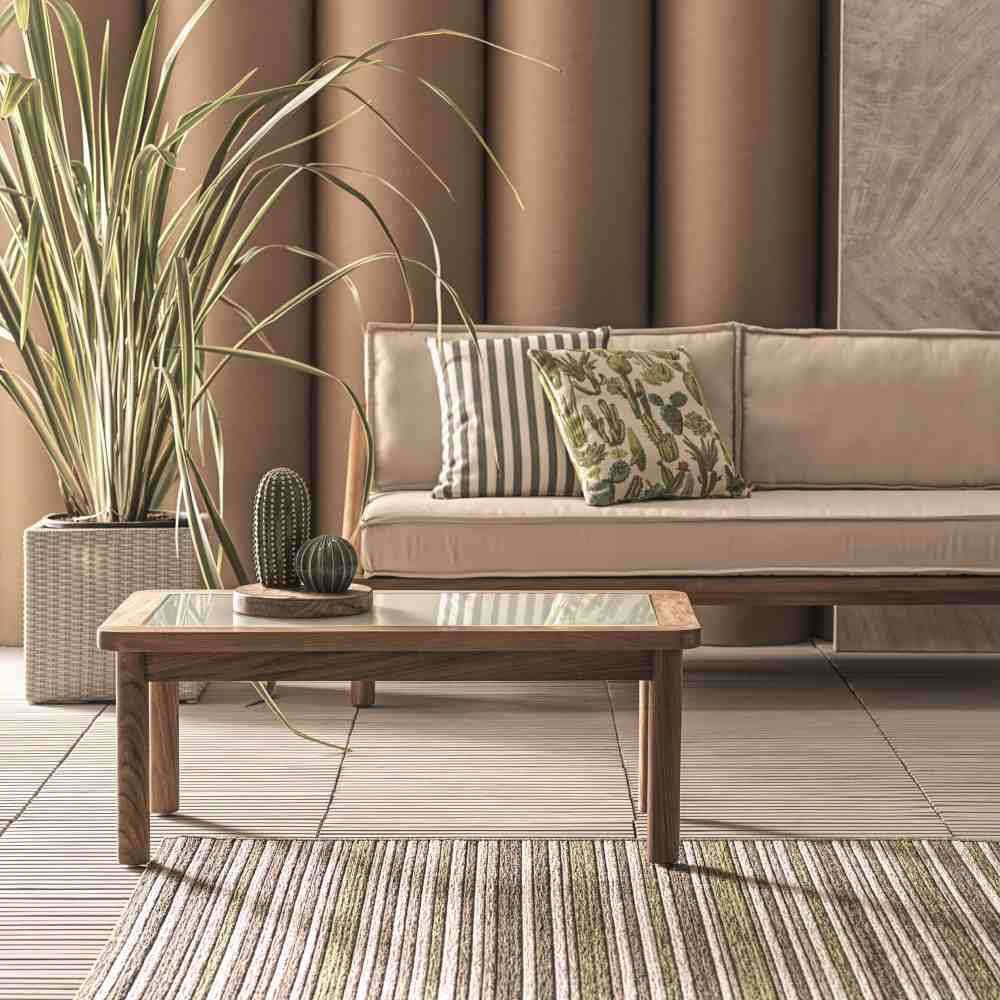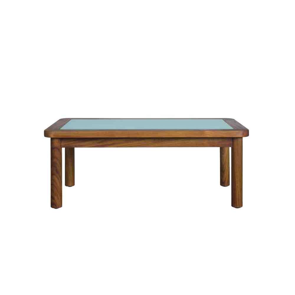 Prostokątny stolik kawowy z blatem z matowego szkła i konstrukcją z drewna tekowego. Szklany blat dodaje elegancji, a drewniana konstrukcja w ciemnym kolorze dobrze komponuje się z ogrodem w stylu klasycznym.