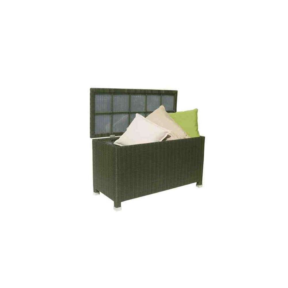 Komoda do przechowywania poduszek na zewnątrz z wikliny, wykonana z najbardziej wytrzymałych włókien sztucznych i jest w pełni odporna na warunki atmosferyczne. Konstrukcja ramy wewnętrznej wykonana jest z aluminium pokrytego tkanym syntetycznym włóknem rattanowym. Nóżki z satynowego aluminium z teflonowymi ślizgaczami. Rozmiary: Szerokość: 122 cm - Głębokość: 54 cm - Wysokość: 65 cm