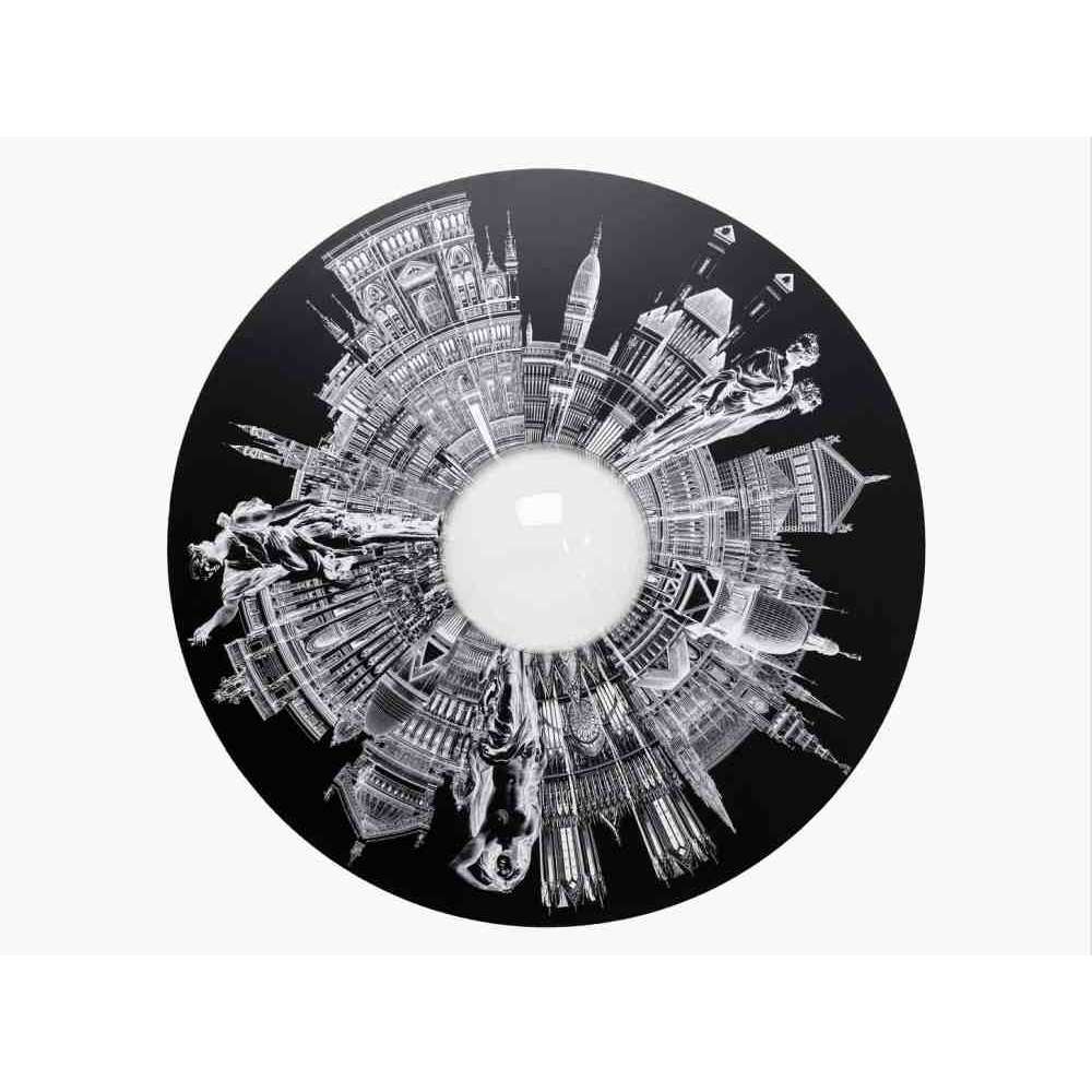 Duży, okrągły obiekt wypełnia nagie ściany czarno-białym motywem obrazu o wysokim kontraście, złożonym z historycznych budynków i rzeźb.