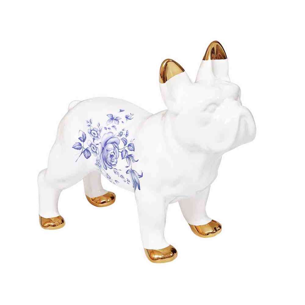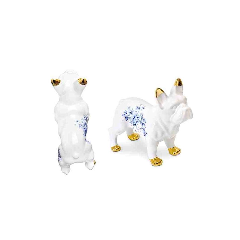 Ceramiczny, ceramiczny pies, buldog, buldog francuski, Delft, kominek, różany, kwiatowy, niebieski, złoty, pozłacany, połysk