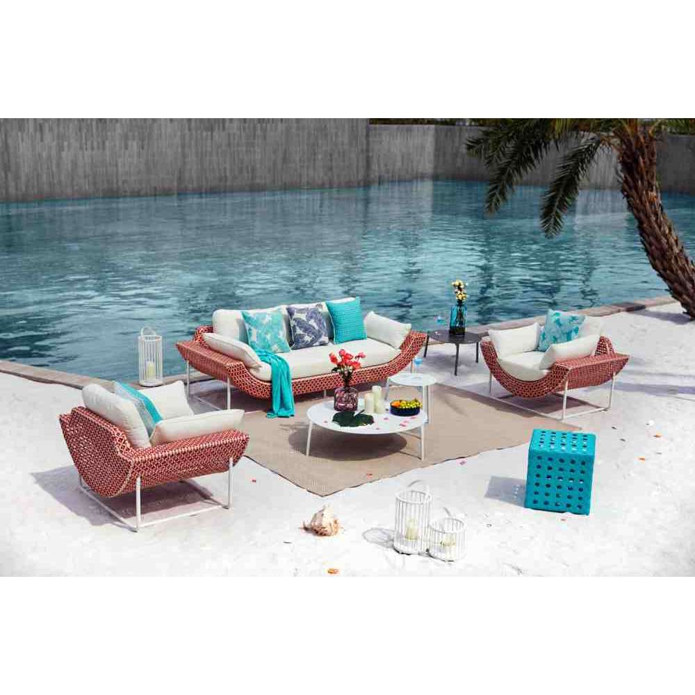 Kanapa zewnętrzna w ramie aluminiowej malowanej farbą epoksydową na biało, pokrytej plecionym włóknem Wintech PE. Siedziska i poduszki z tkaniny Sunbrella®. Oplot dostępny w 3 różnych wzorach, biały / pomarańczowy / czerwony lub biały / szary / niebieski lub biały / szary / biały. Kolory siedzisk, oparć i poduszek do wyboru z całej gamy Sunbrella®.