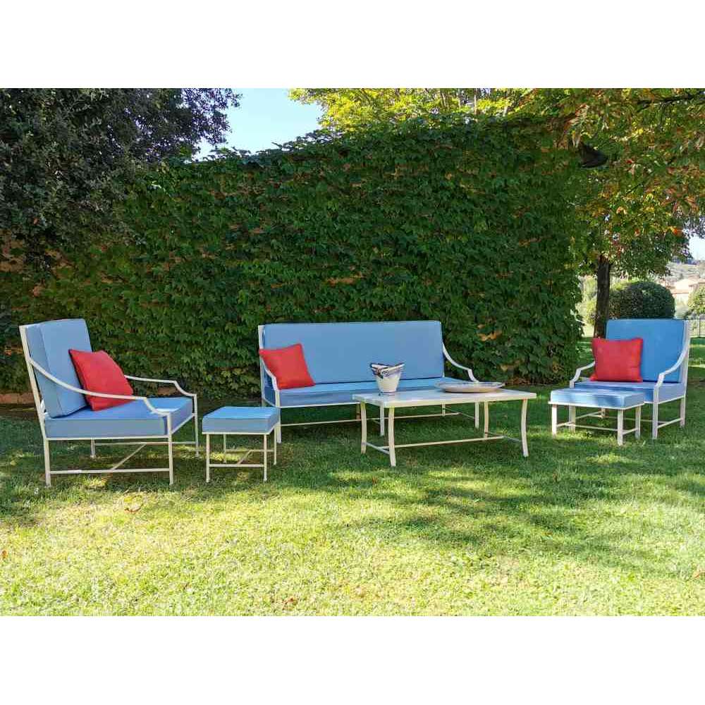 Perennial to żelazna pufa o nowoczesnym designie, zawierająca poduszki z tkaniny zewnętrznej, ocynkowana i malowana proszkowo.