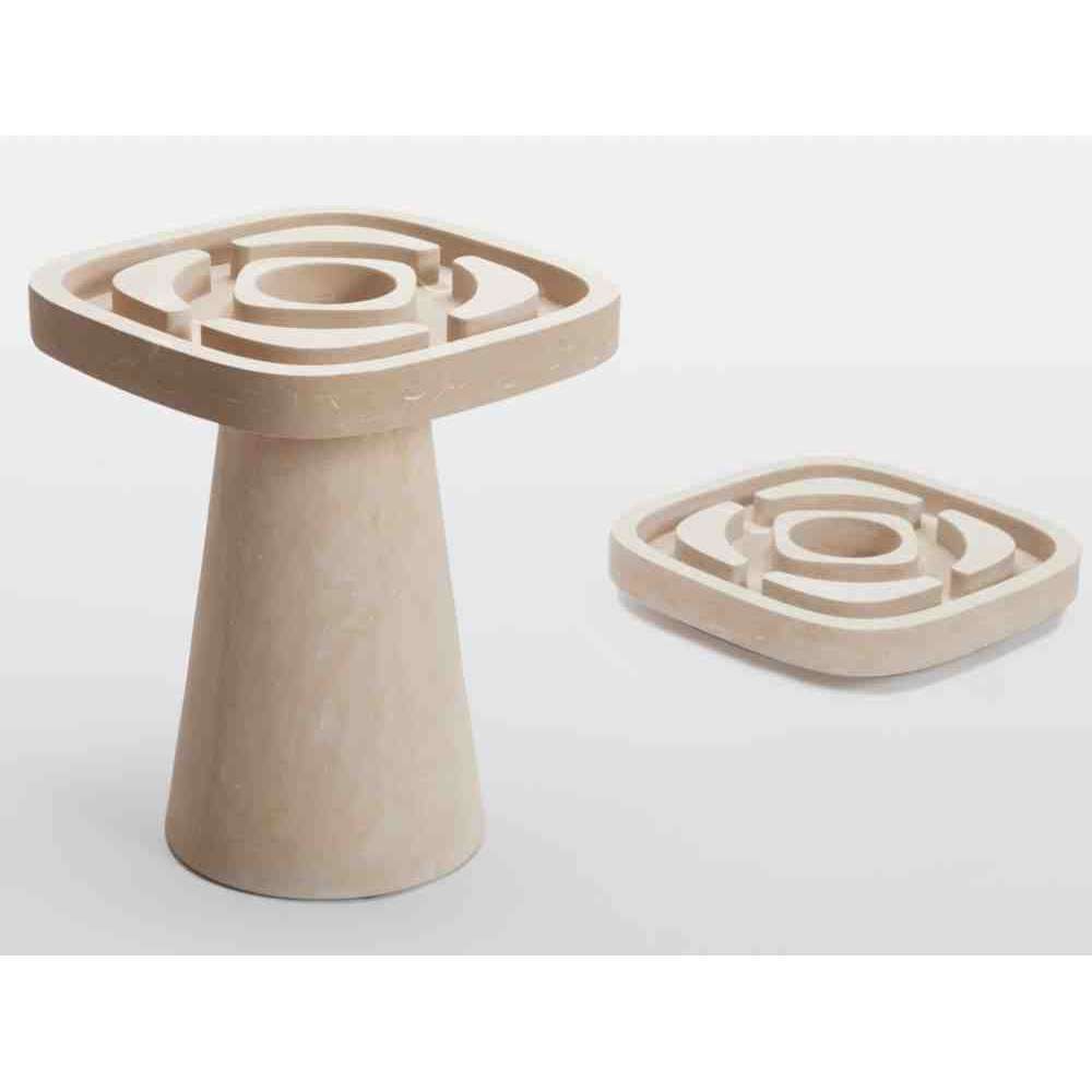 Giardino all'italiana to stolik pomocniczy z naturalnego beżowego kamienia Pimar. Projekt ten jest inspirowany, jak sama nazwa wskazuje, ogrodami w stylu włoskim, unowocześnionym ze współczesnością. Ogród przekształcony w obiekt z kamienia spełnia wiele funkcji: w wyrzeźbionych niszach można uprawiać rośliny, dodawać piasek i tworzyć suchy ogród (podobny do japońskiego Bonseki) lub po prostu używać go jako stolika.