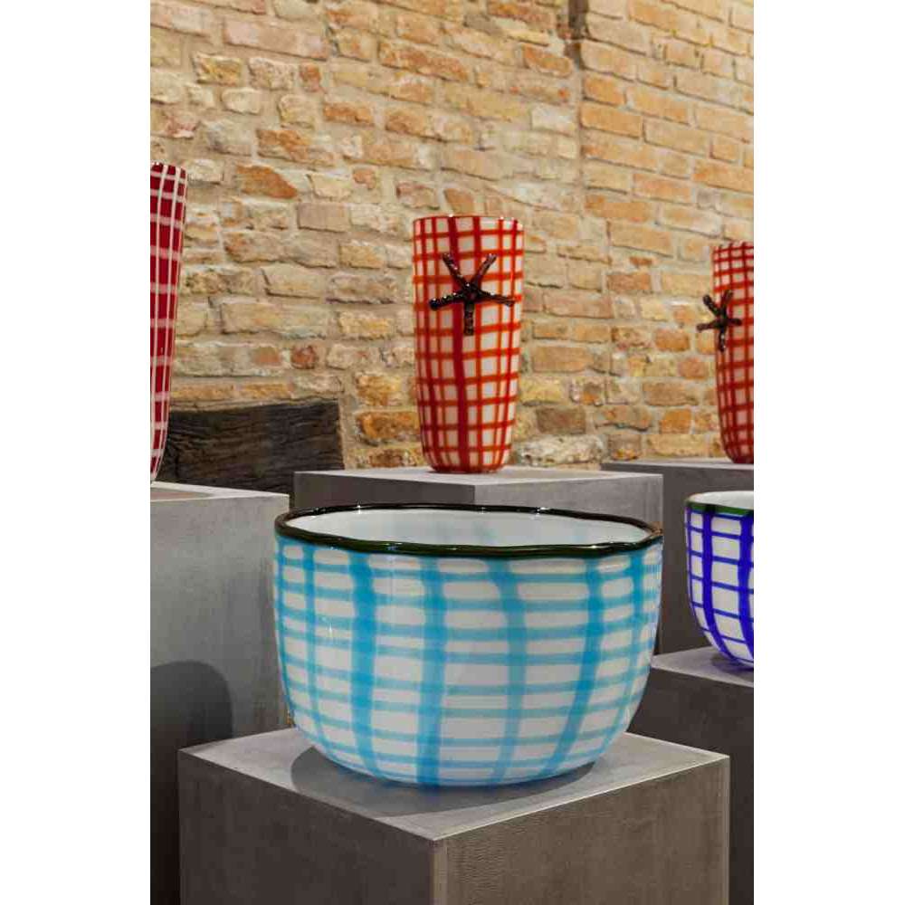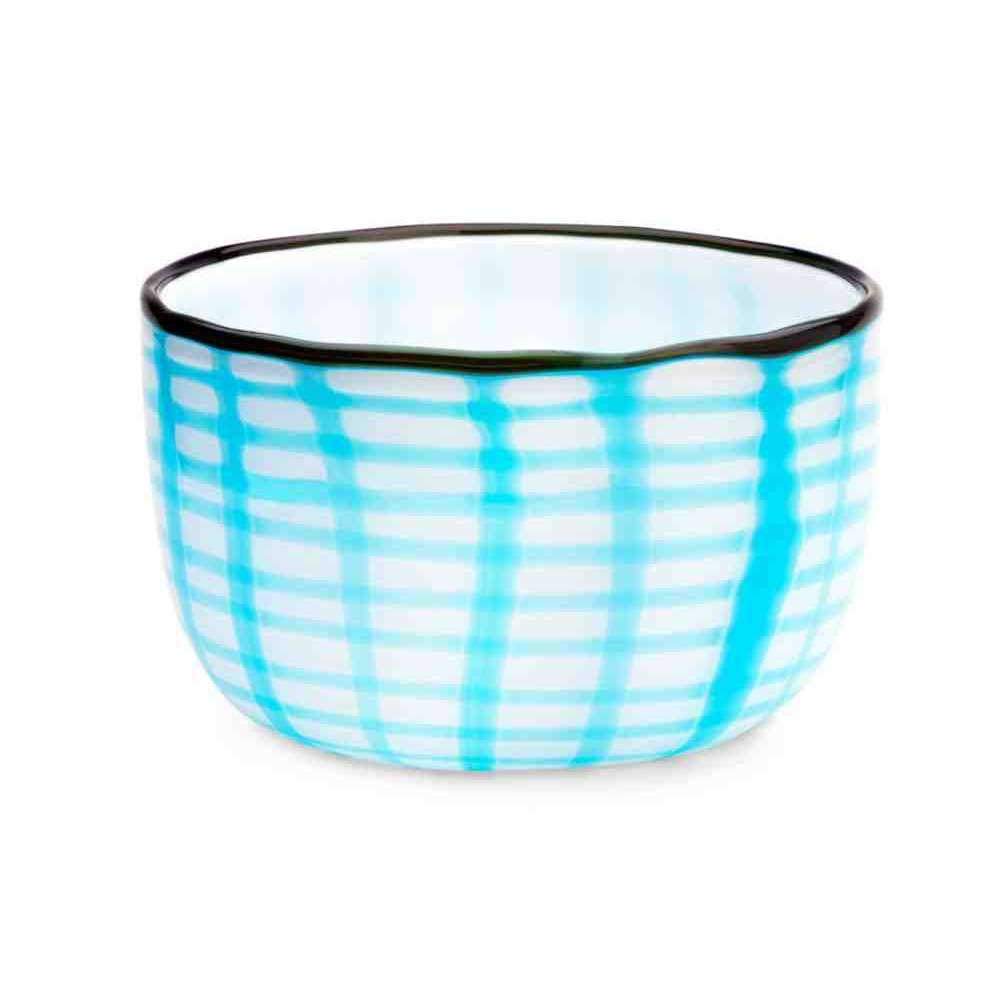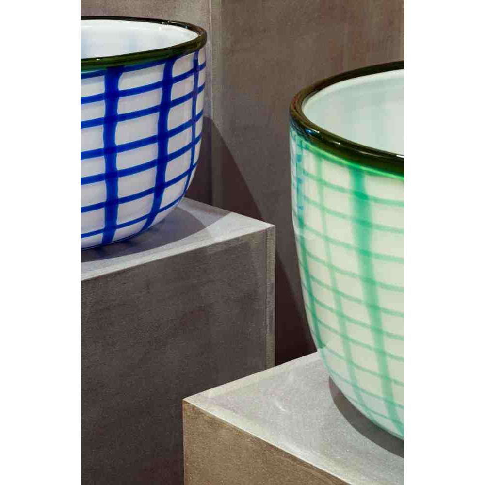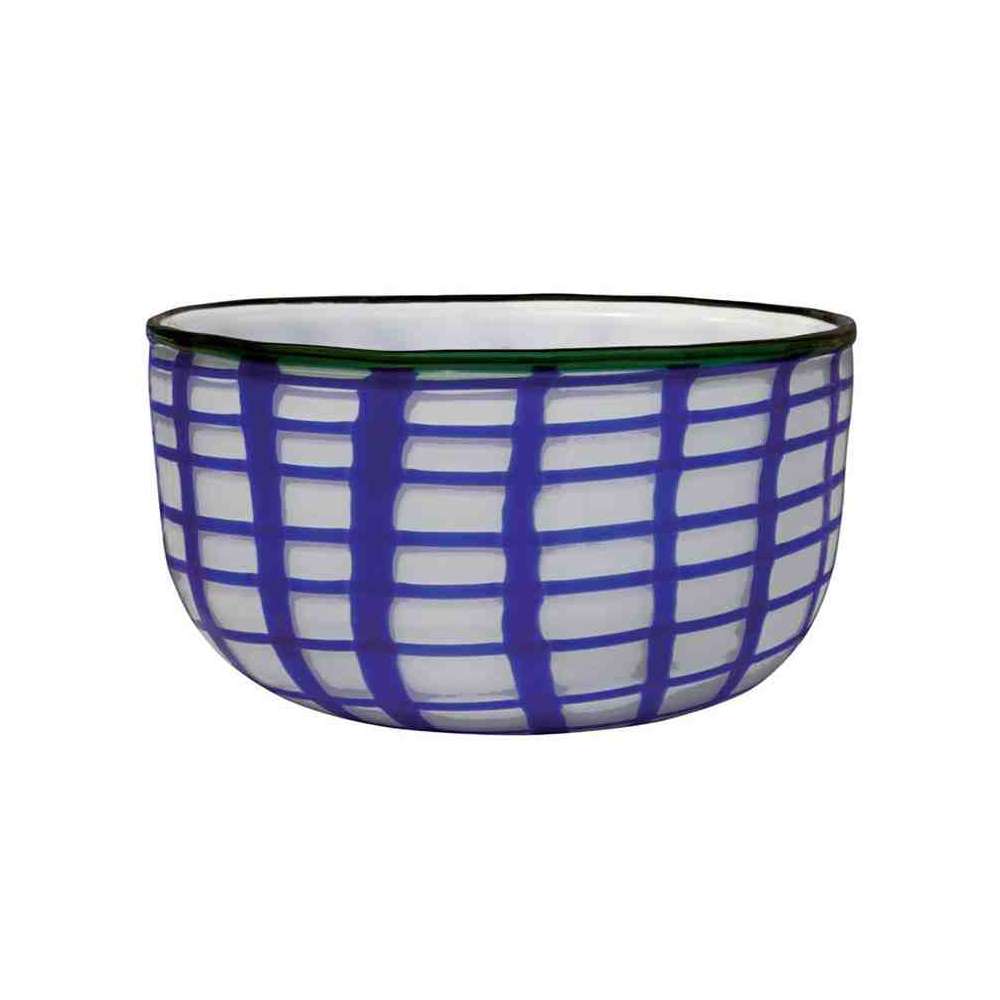 Edie Bowl , dostępny w kolorach: niebieski / zielona laguna / śródziemnomorski niebieski ze szmaragdową obwódką, wykonany jest z dmuchanego szkła Murano ozdobionego niewyraźnym geometrycznym wzorem.
