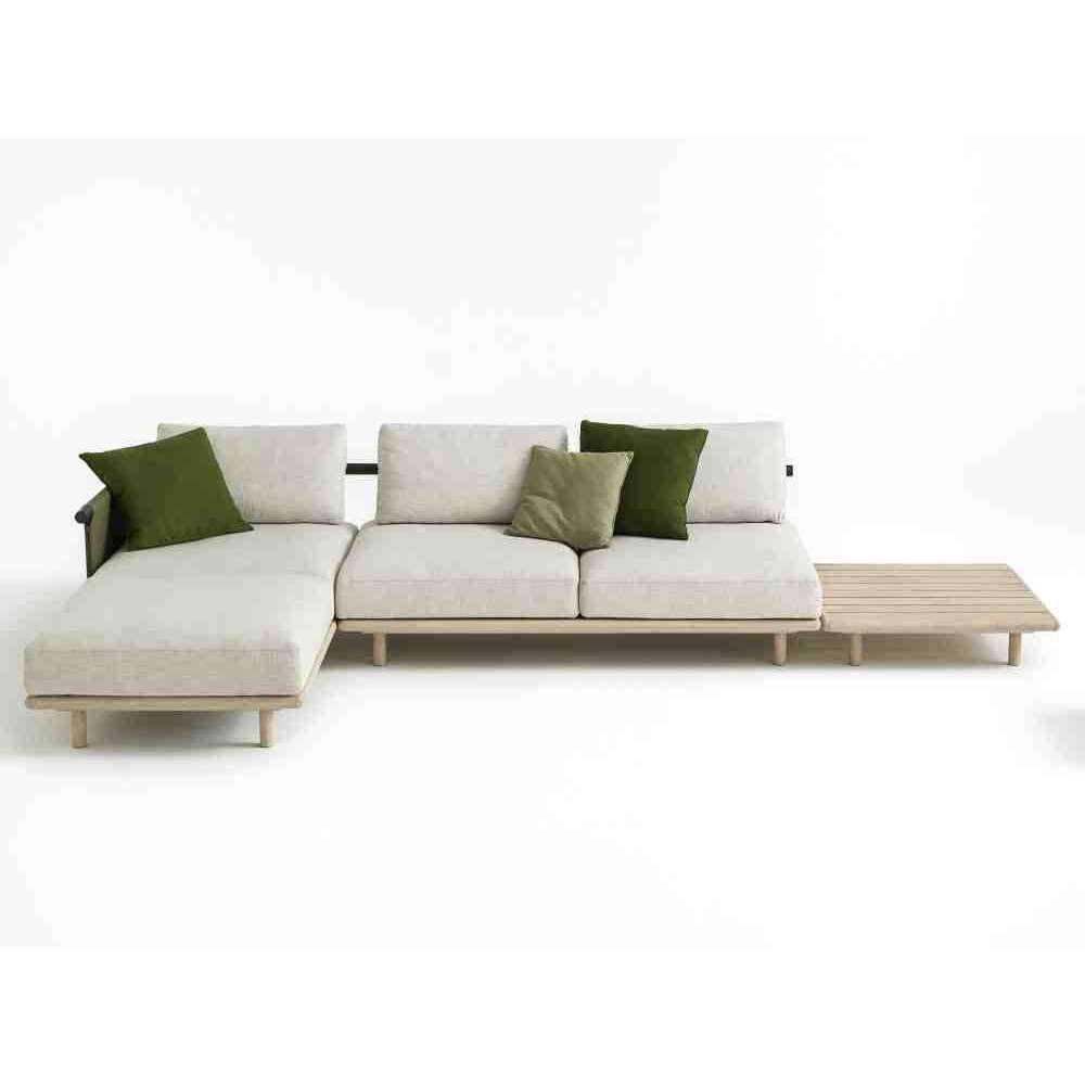 Wreszcie, aby uzupełnić system EDEN, sofę można połączyć ze stolikiem kawowym z bielonego drewna tekowego, co zapewnia ciągłość z projektami i wykończeniami modułów.
