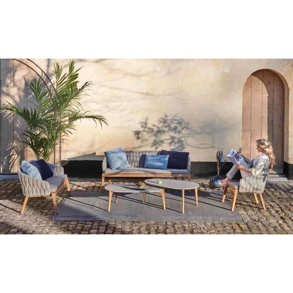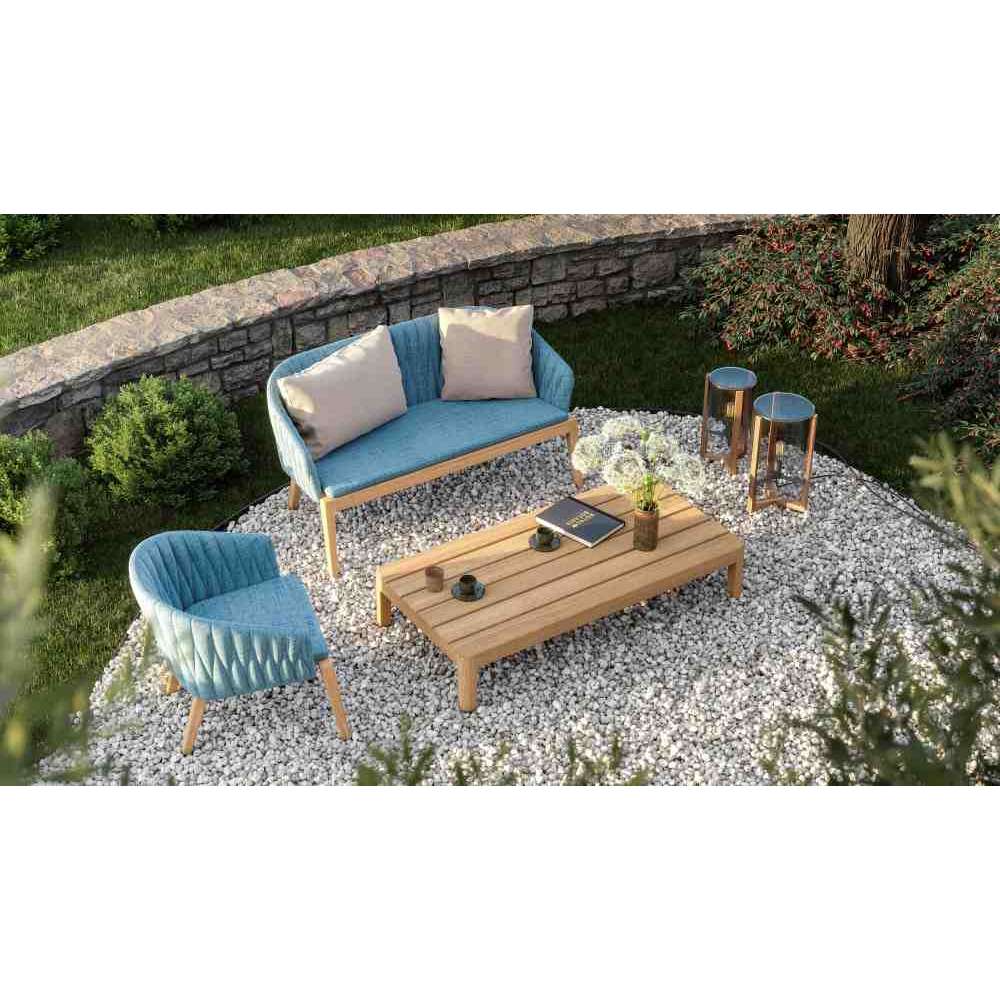 Calypso to dwuosobowa sofa ogrodowa z tkaniny i drewna tekowego.
