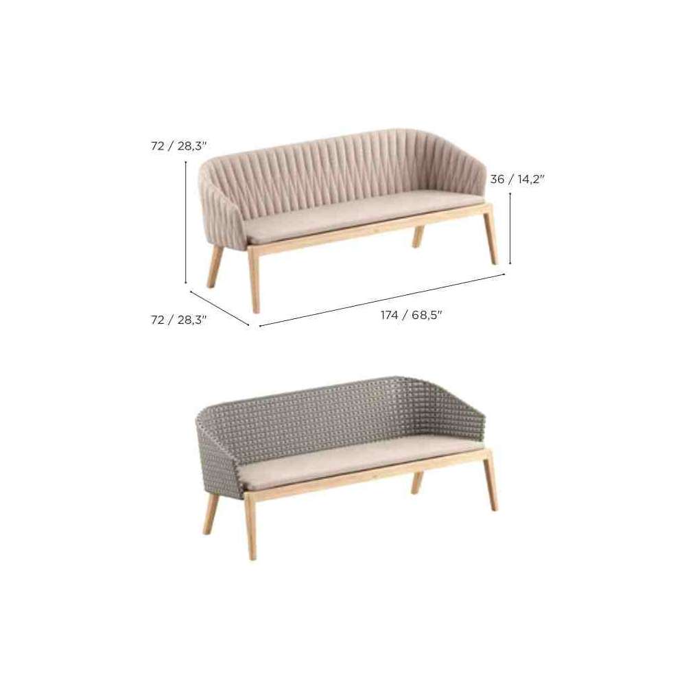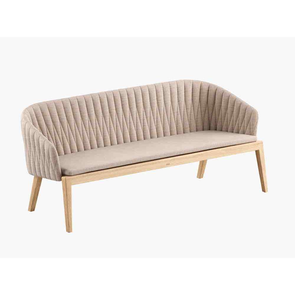 Calypso to trzyosobowa tkanina i sofa ogrodowa z drewna tekowego.
