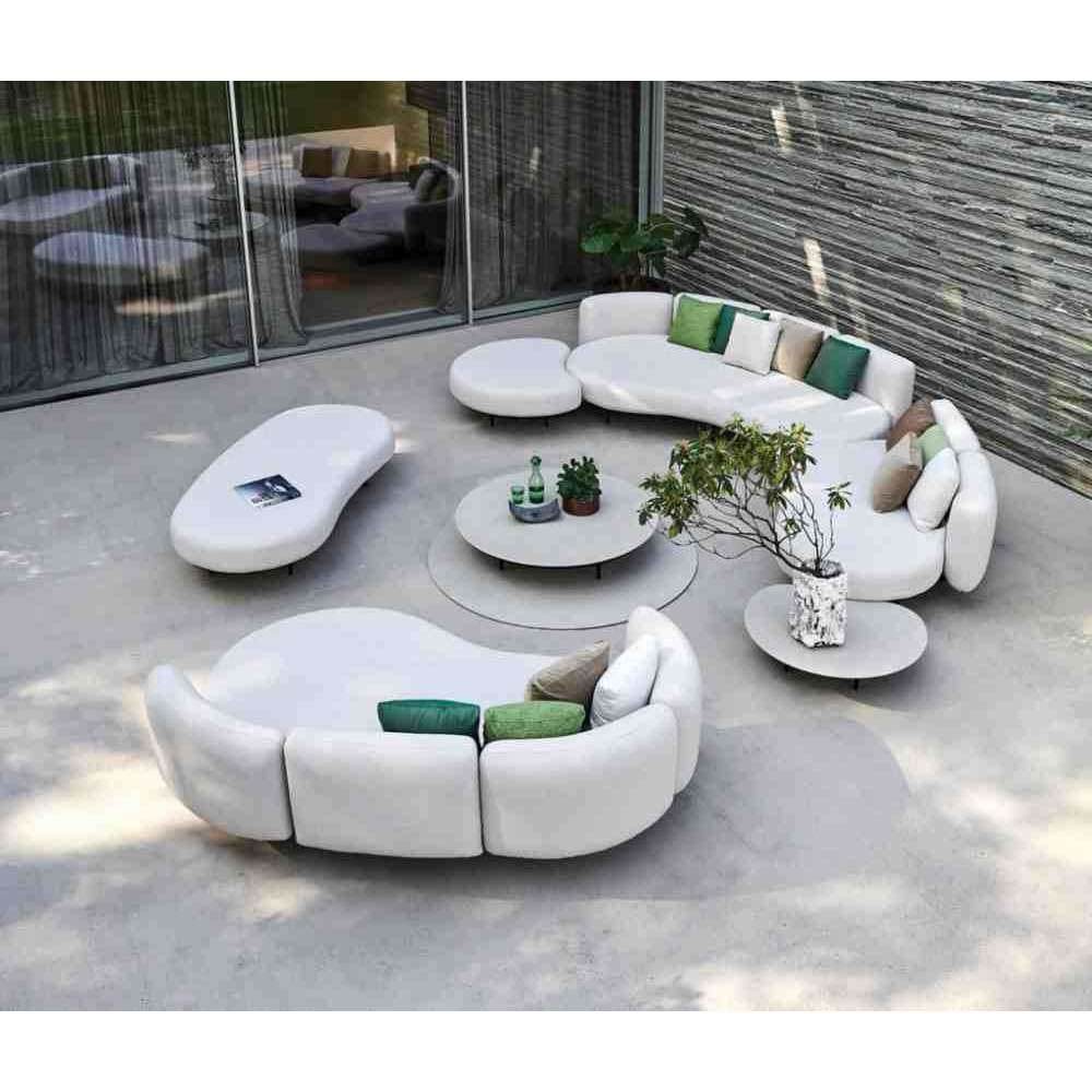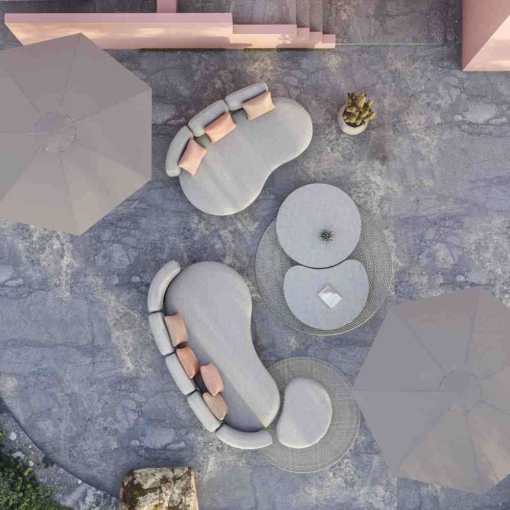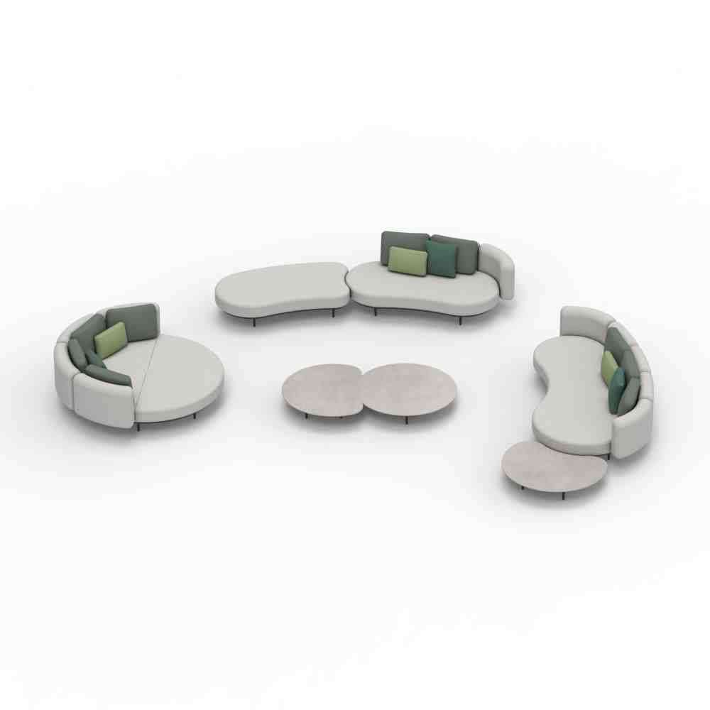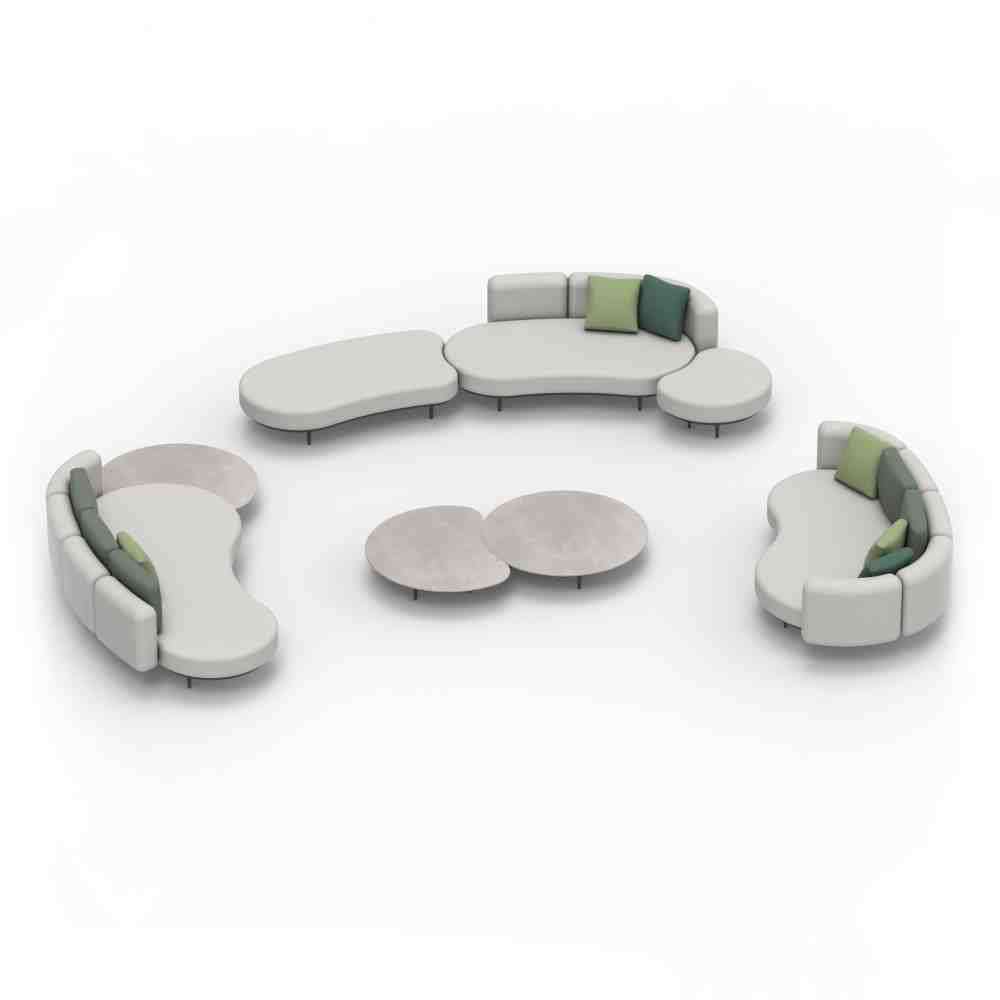 Poduszki oparciowe mają trzy różne krzywizny, aby pasowały do elementów w kształcie nerki i można je łatwo przymocować do aluminiowych podstaw według potrzeb. W rezultacie możliwości rozplanowania są nieograniczone, podobnie jak kombinacje kolorów tkanin i blatów ceramicznych, co pozwala dostosować zestaw wypoczynkowy Organix do osobistych preferencji.