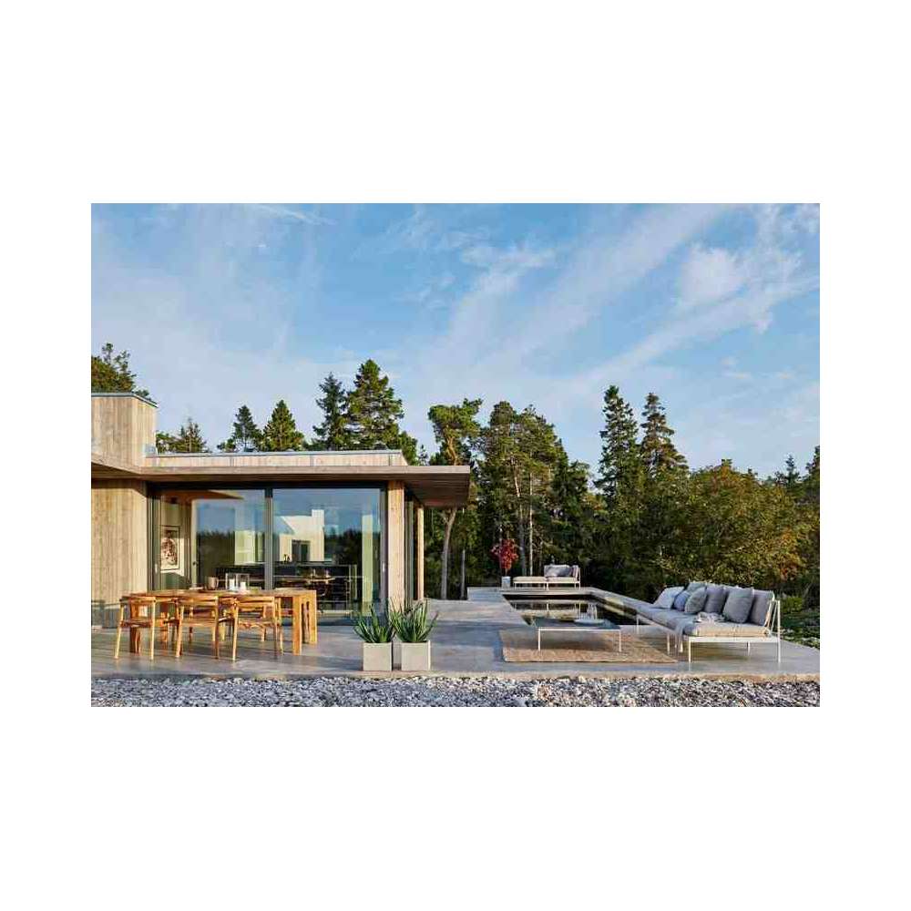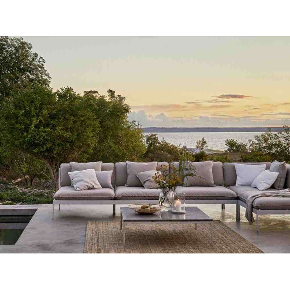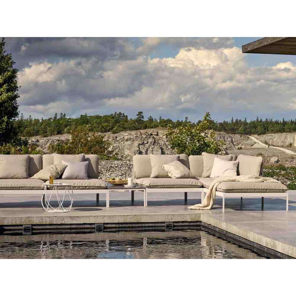 Sprytny system modułowych sof, do całorocznego użytku na zewnątrz. Bardzo wszechstronna, bardzo wytrzymała. Ramy wykonane są z aluminium, poduszki z tkaniny outdoorowej Sunbrella i wypełnione pianką Quickdry.