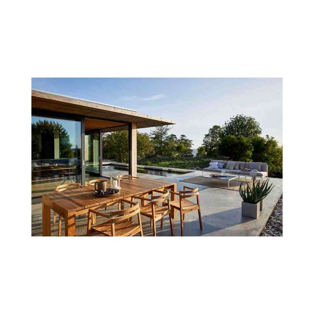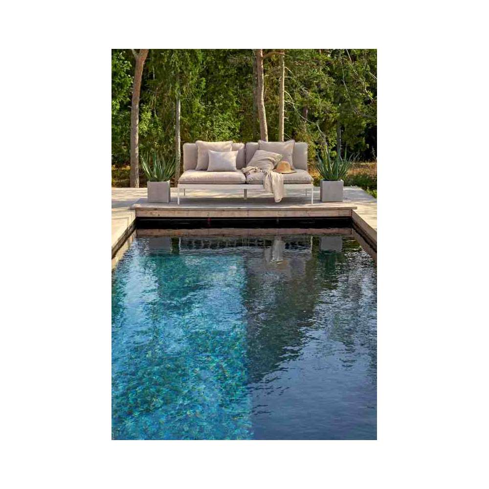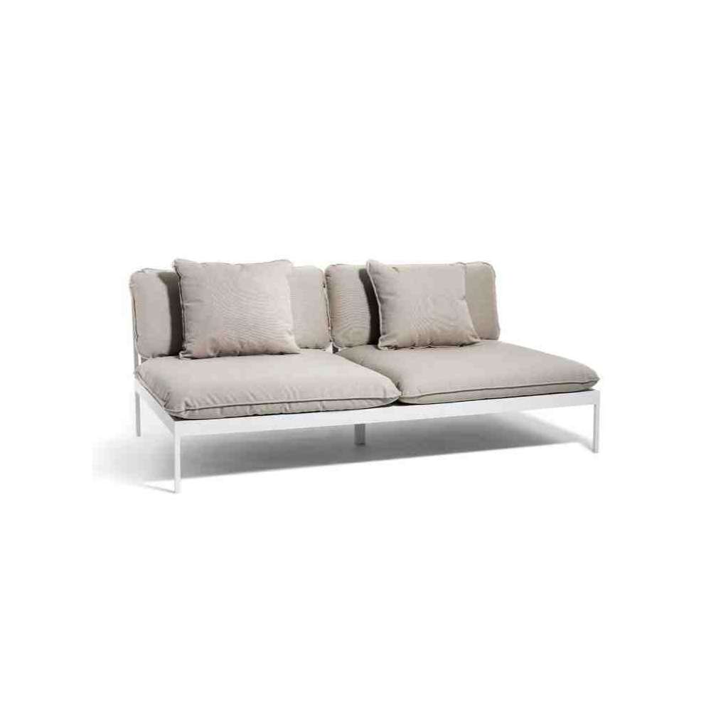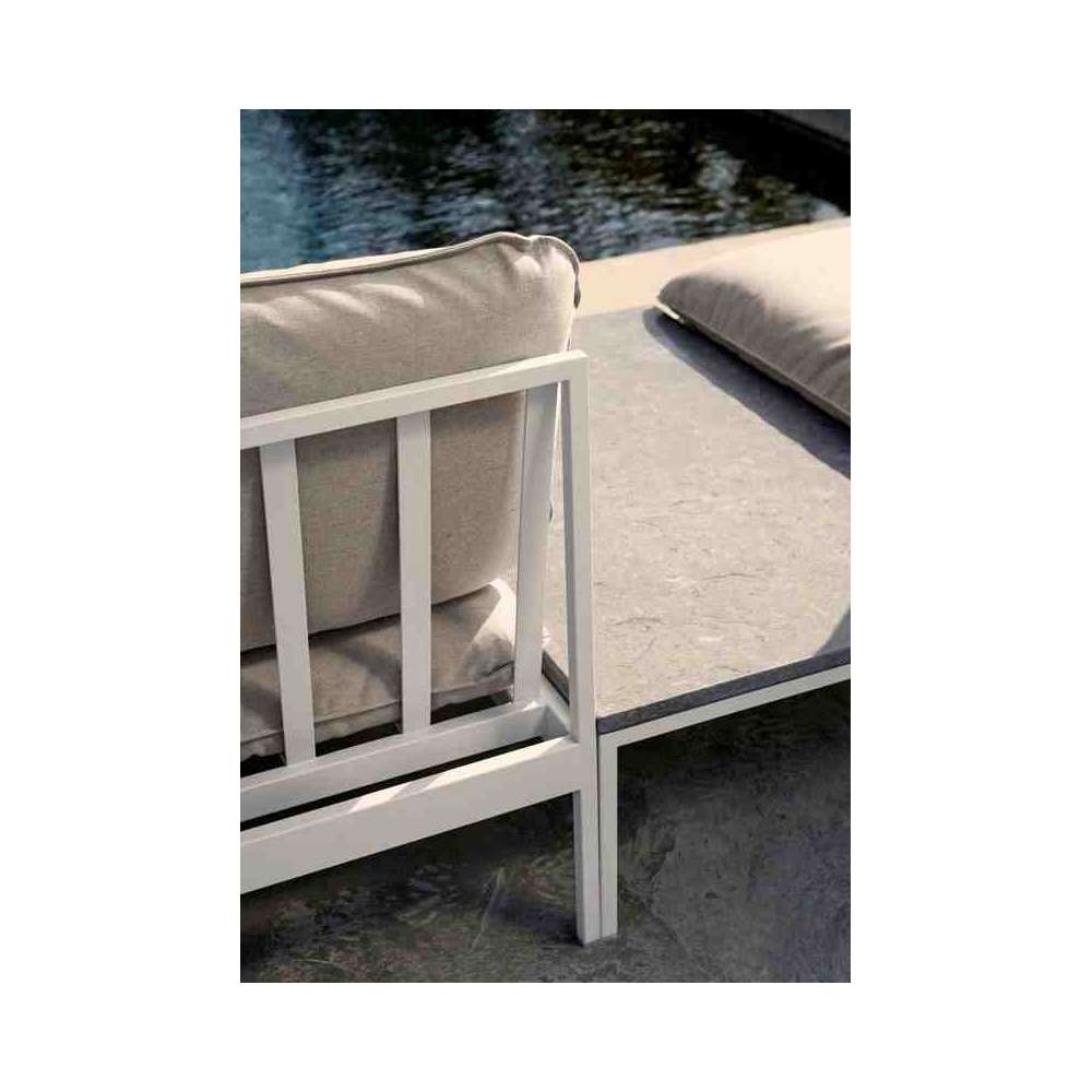 Sprytny system modułowych sof, do całorocznego użytku na zewnątrz. Bardzo wszechstronna, bardzo wytrzymała. Ramy wykonane są z aluminium, poduszki z tkaniny outdoorowej Sunbrella i wypełnione pianką Quickdry.