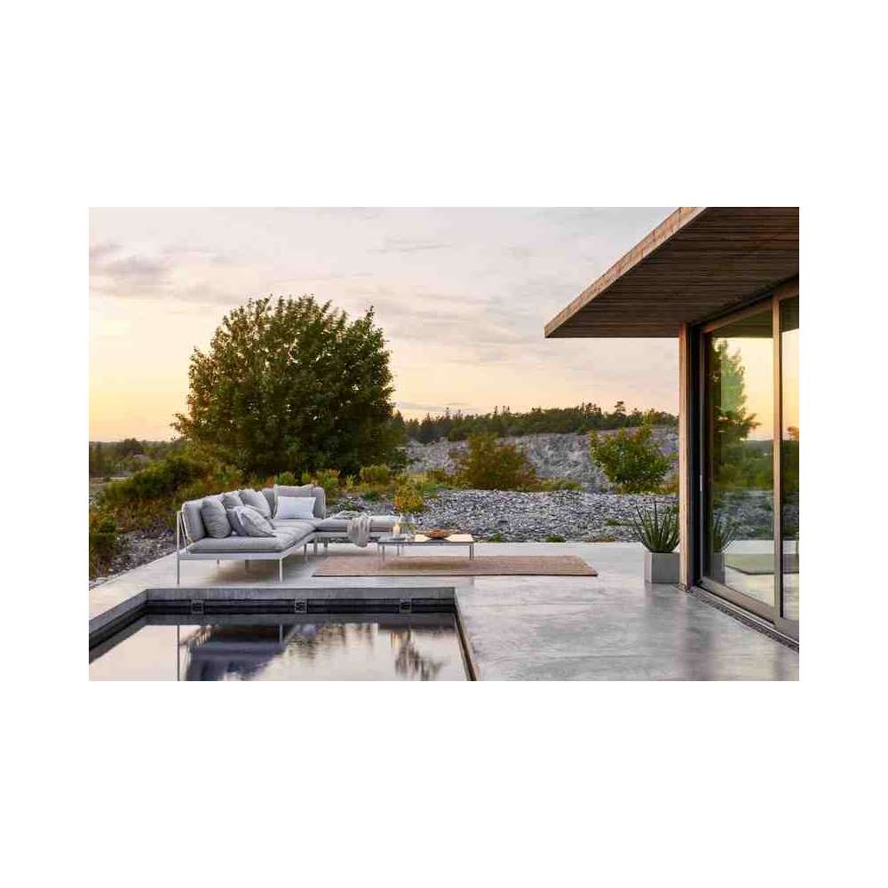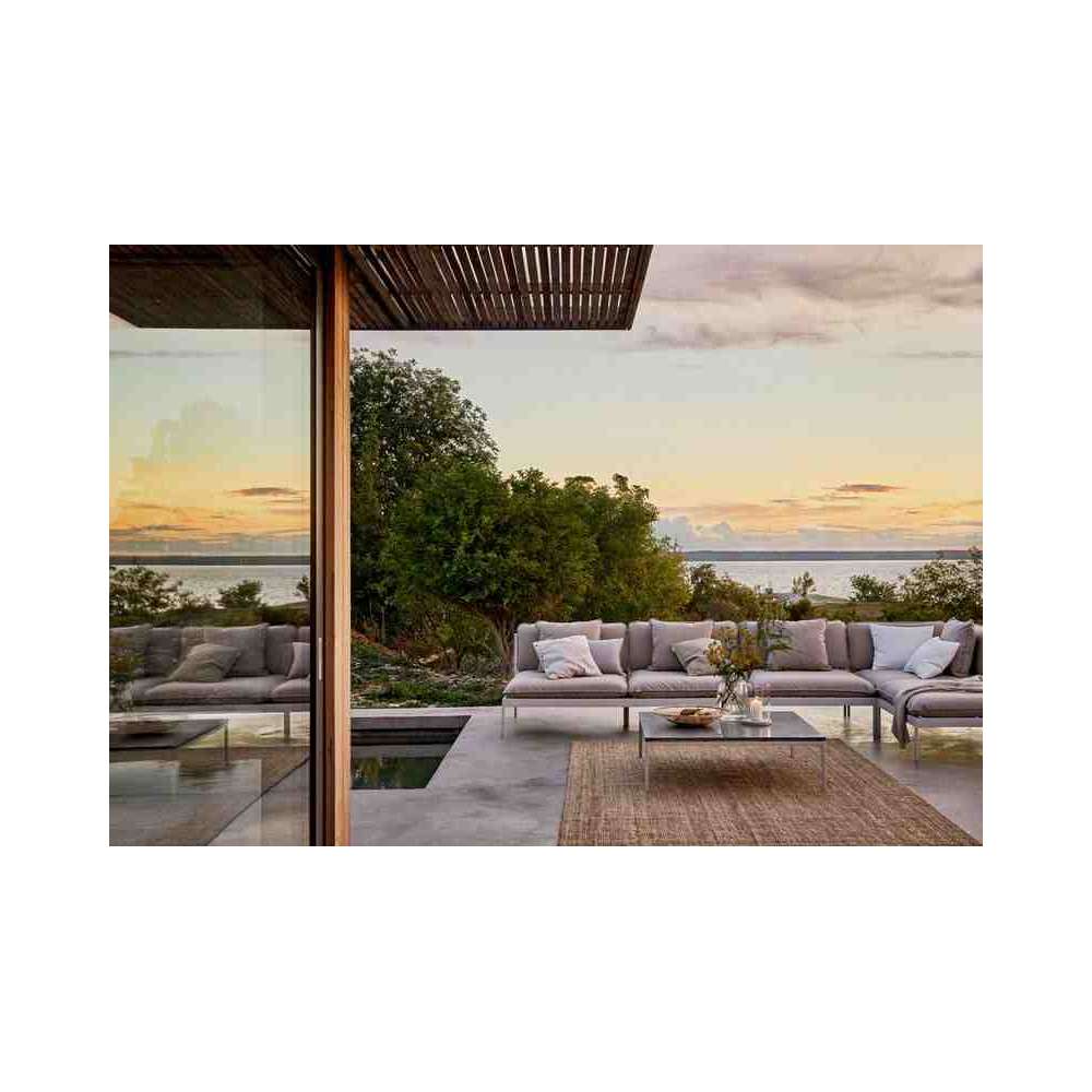 Sprytny system modułowych sof, do całorocznego użytku na zewnątrz. Bardzo wszechstronna, bardzo wytrzymała. Ramy wykonane są z aluminium, poduszki z tkaniny outdoorowej Sunbrella i wypełnione pianką Quickdry.