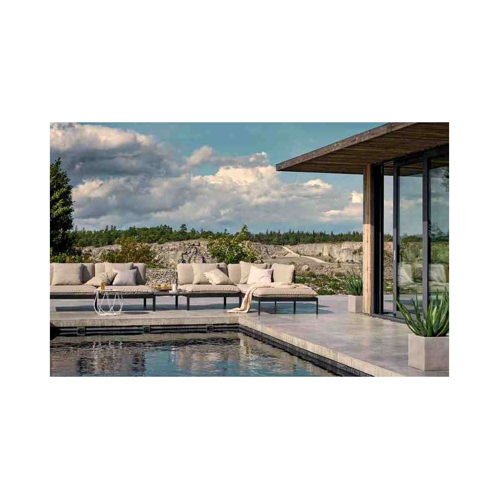 Sprytny system modułowych sof, do całorocznego użytku na zewnątrz. Bardzo wszechstronna, bardzo wytrzymała. Ramy wykonane są z aluminium, poduszki z tkaniny outdoorowej Sunbrella i wypełnione pianką Quickdry.
