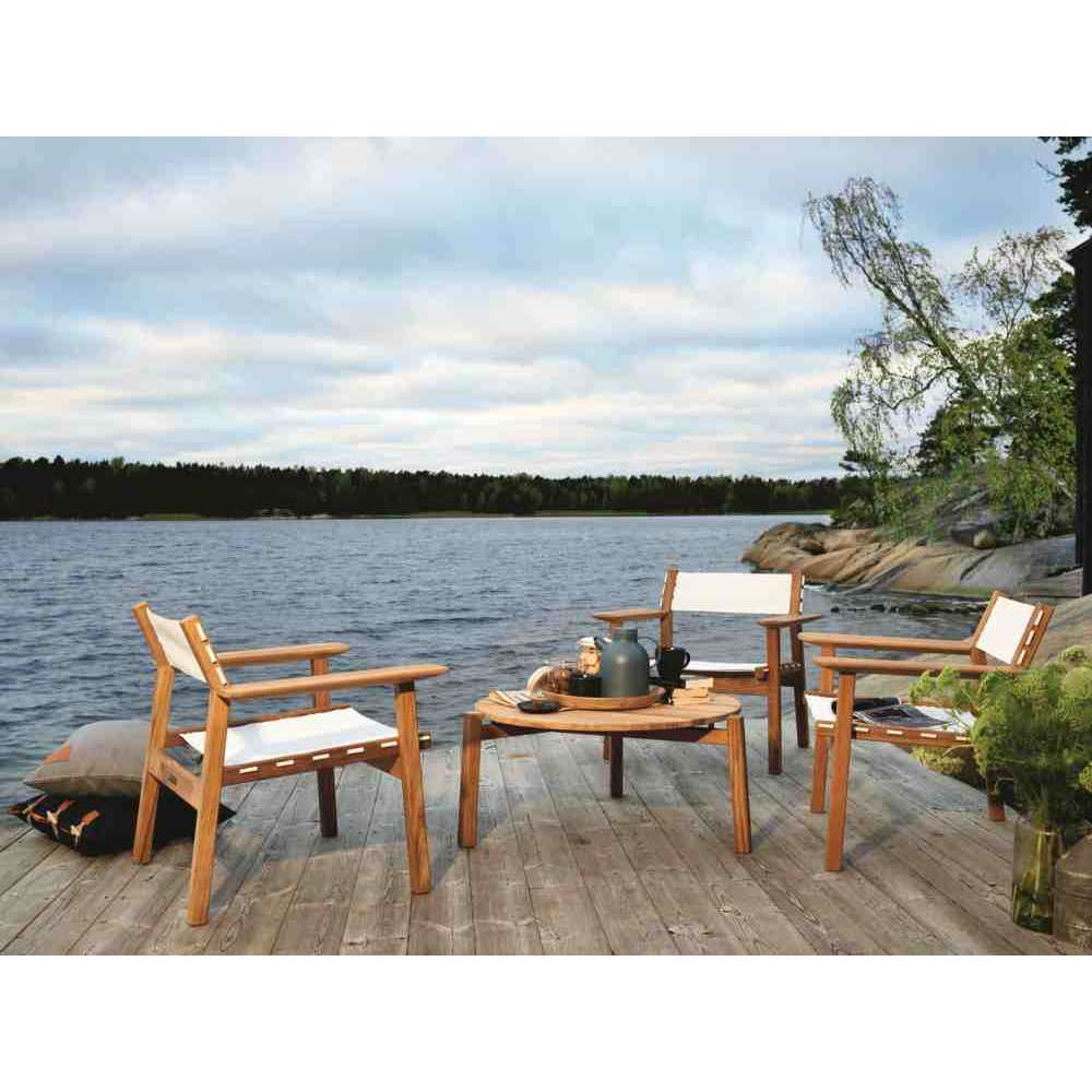 Djurö to salon i jadalnia z drewna tekowego. Fotel jest dostępny z siedziskiem i oparciem wykonanym z tkaniny Batyline firmy Ferrari lub wykonanym w całości z drewna tekowego. Istnieje również pasujący podnóżek z drewna tekowego. Krzesło do jadalni wykonane w całości z drewna tekowego lub z siedziskiem i oparciem z tkaniny Batyline. Jest jeden okrągły i dwa prostokątne stoły jadalne, mieszczące do sześciu (w rzeczywistości aż osiem, jeśli użyjesz ich na końcach). Są dwa niższe, okrągłe stoły, które pasują do leżaków. Meble można olejować co roku, jeśli są używane na zewnątrz i jeśli chcesz zachować ich oryginalny wygląd. Jeśli nie zdecydujesz się na ich olejowanie, powoli zmienią kolor na piękną patynowaną szarość. Batyline Duo jest odporny na warunki atmosferyczne i stworzony, aby poradzić sobie w każdych warunkach pogodowych. Projekt autorstwa Matyldy Lindblom.