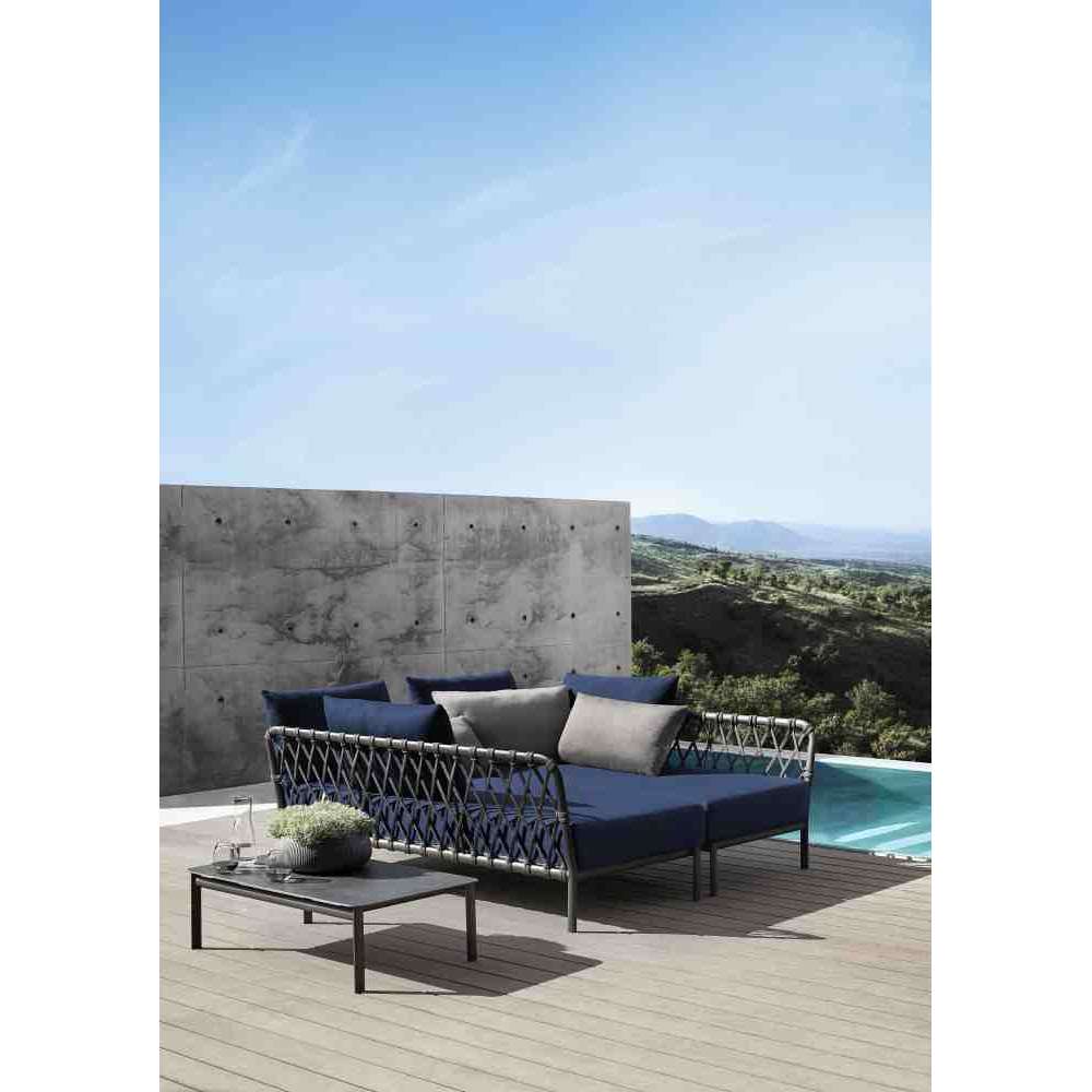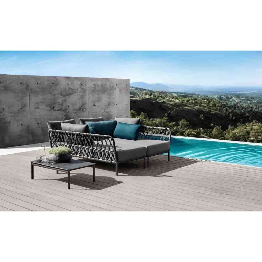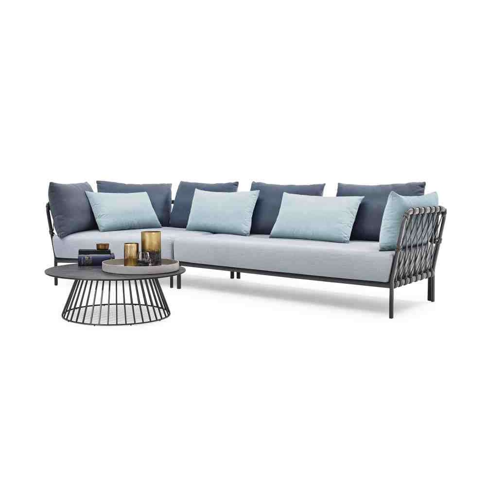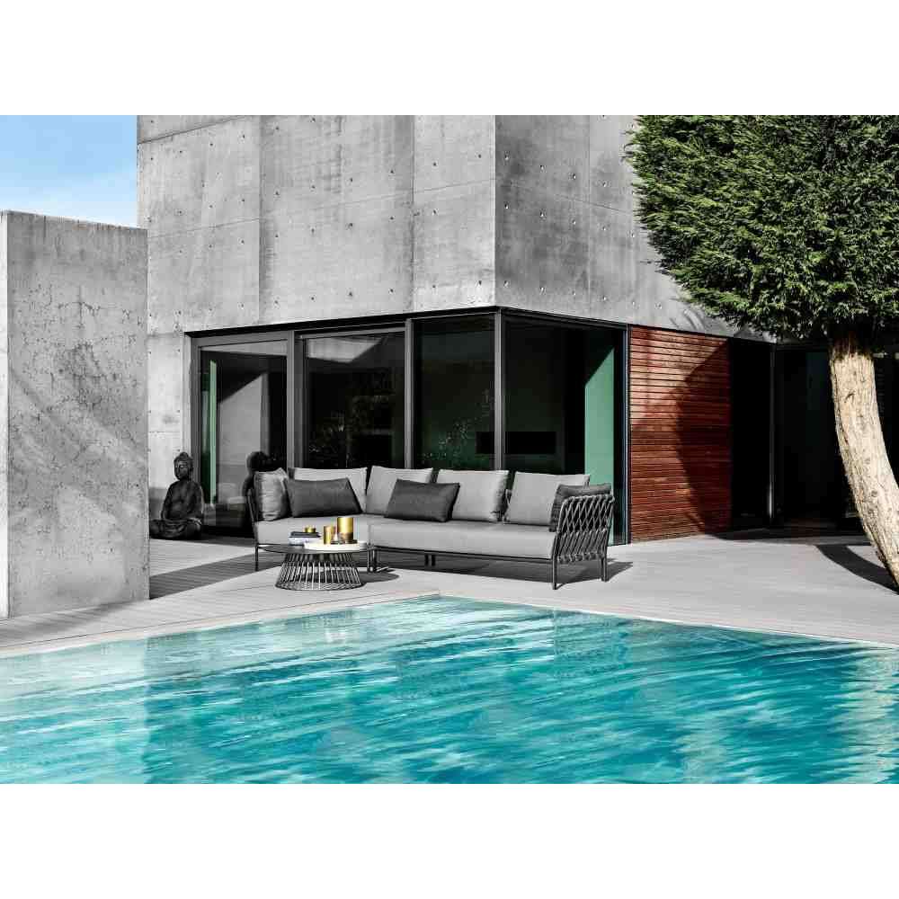 Czy to przy basenie, czy na tarasie, CARO Outdoor Lounge oferuje luksusowe siedzenia na relaksujące dni lub przytulne letnie wieczory, nie pozostawiając nic do życzenia, jeśli chodzi o dobre samopoczucie i komfort. Pokryte antracytowym wykończeniem aluminiowe ramy CARO charakteryzują się zaokrągloną sylwetką, delikatnie przeplatanymi filigranowymi splotami wykonanymi z plenerowej liny String Flex i doskonale uzupełniają luksusowe poduszki do siedzenia i wygodne poduszki do rzucania. Dwa stoliki o różnej wysokości z optycznie jasnymi blatami w różnych kolorach ceramiki nadają całości wykończenia.