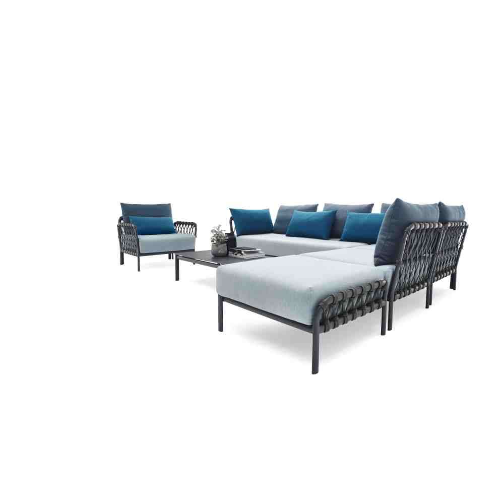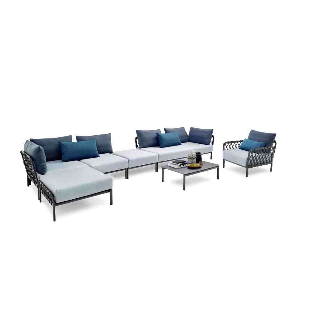 Modułowy salon na świeżym powietrzu składający się z siedmiu różnych siedzisk i dwóch stolików bocznych