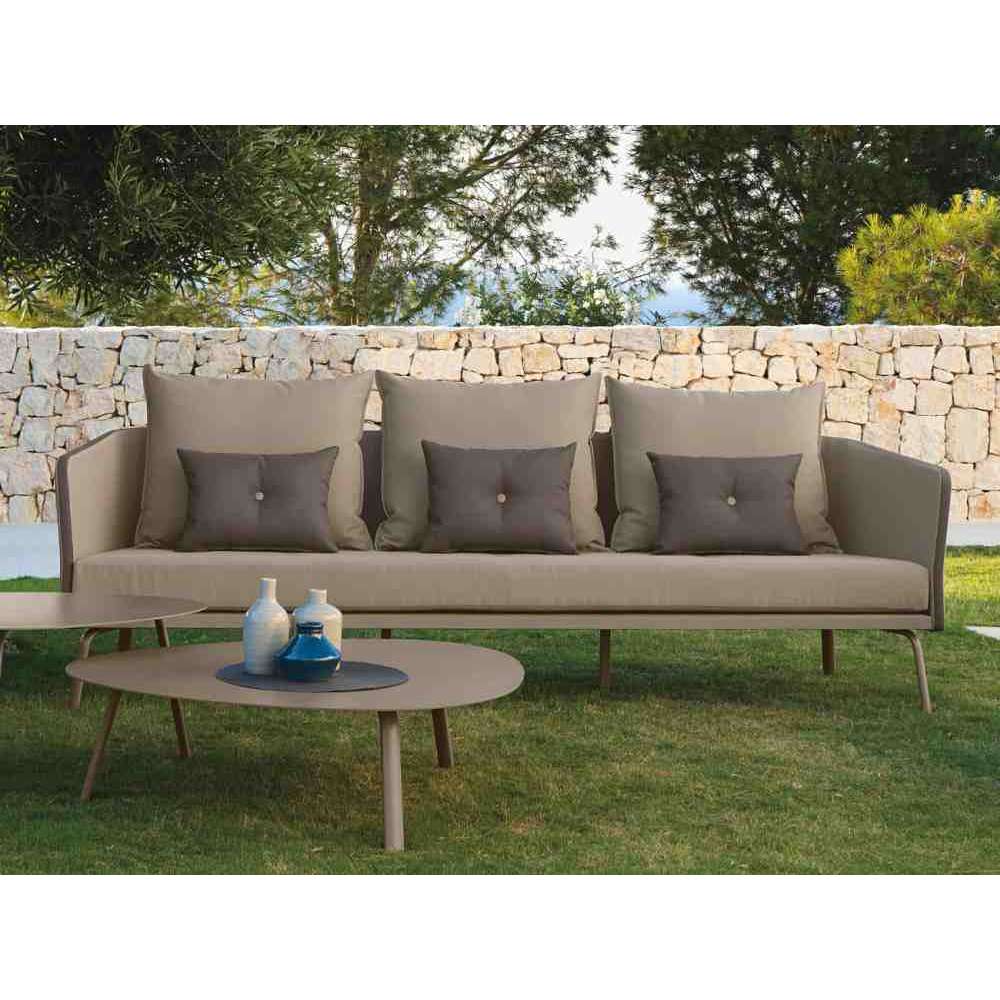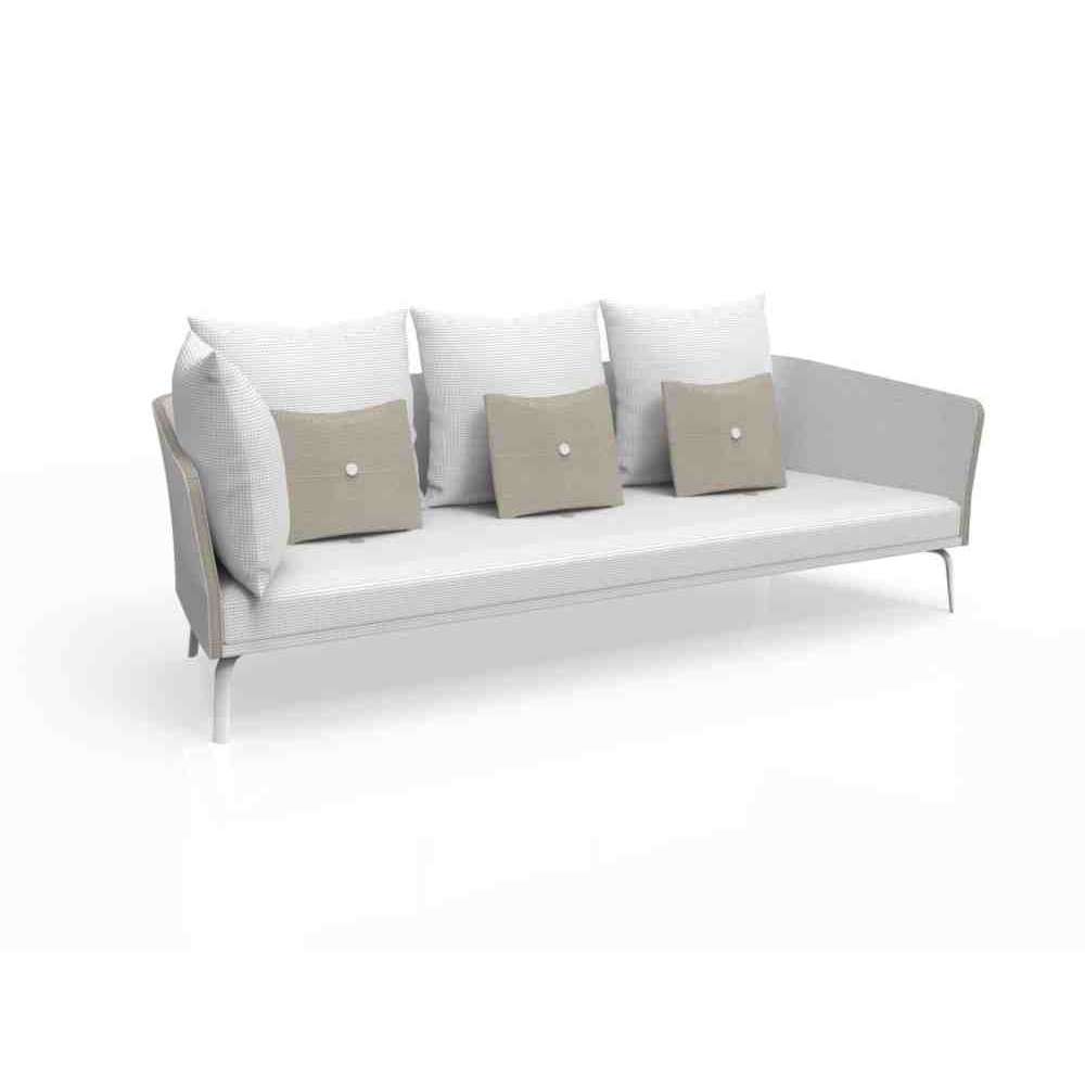 Sofa ogrodowa tekstylna trzyosobowa, ze zdejmowanym pokrowcem. Rama aluminiowa malowana proszkowo dostępna w trzech różnych kolorach: białym, gołębim i grafitowym; rama jest pomalowana na ten sam kolor co tekstylia. Poduszki ze zdejmowanymi poszewkami, łatwe do prania i odporne na warunki atmosferyczne. Wyściółka z szybkoschnącej pianki.