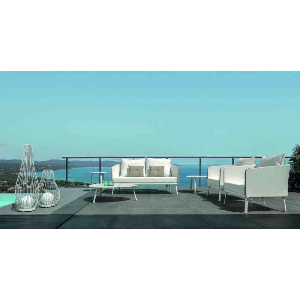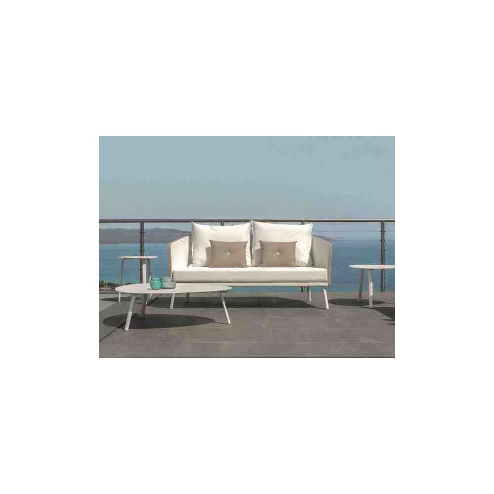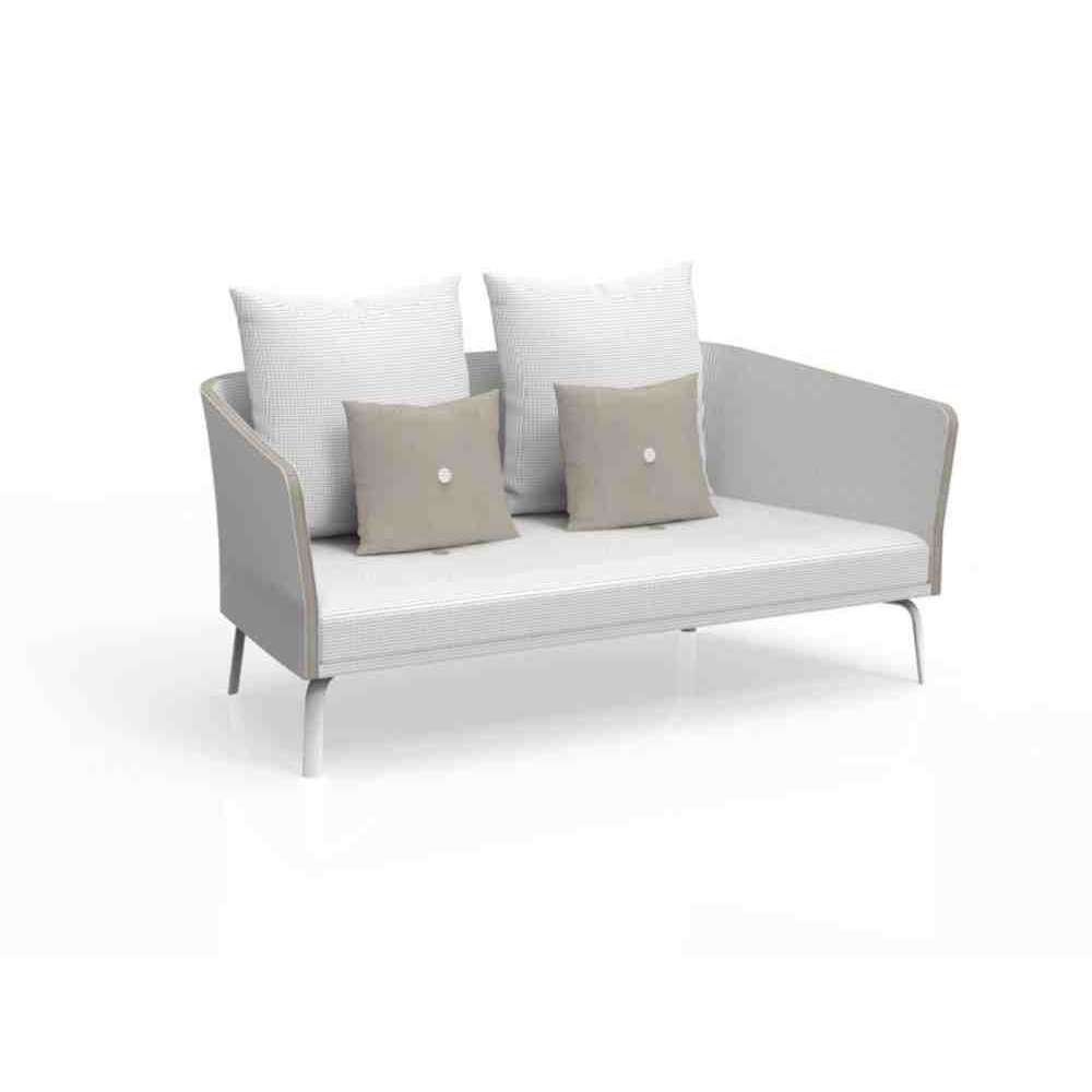 Sofa ogrodowa tekstylna dla dwóch osób, ze zdejmowanym pokrowcem. Rama aluminiowa malowana proszkowo dostępna w trzech różnych kolorach: białym, gołębim i grafitowym; rama jest pomalowana na ten sam kolor co tekstylia. Poduszki ze zdejmowanymi poszewkami, łatwe do prania i odporne na warunki atmosferyczne. Wyściółka z szybkoschnącej pianki.