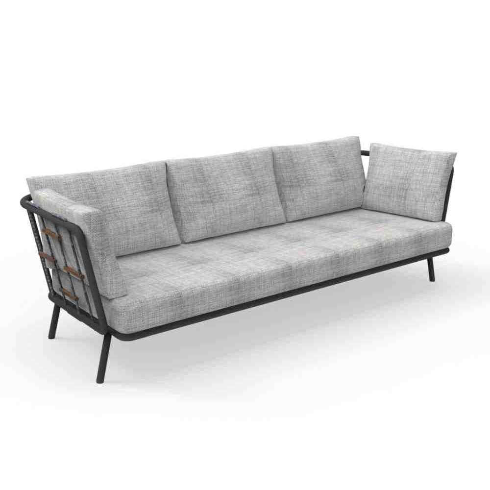Sofa ma rurową aluminiową ramę z linami przechodzącymi przez ramę i cylindrycznymi listwami z drewna tekowego. Poduszki siedziska i oparcia wyściełane szybkoschnącą pianką i tapicerowane tkaniną do użytku na zewnątrz. Wyściółka z szybkoschnącej pianki. Poduszki ze zdejmowanymi pokrowcami z tkaniny, które są łatwe do prania i odporne na warunki atmosferyczne.