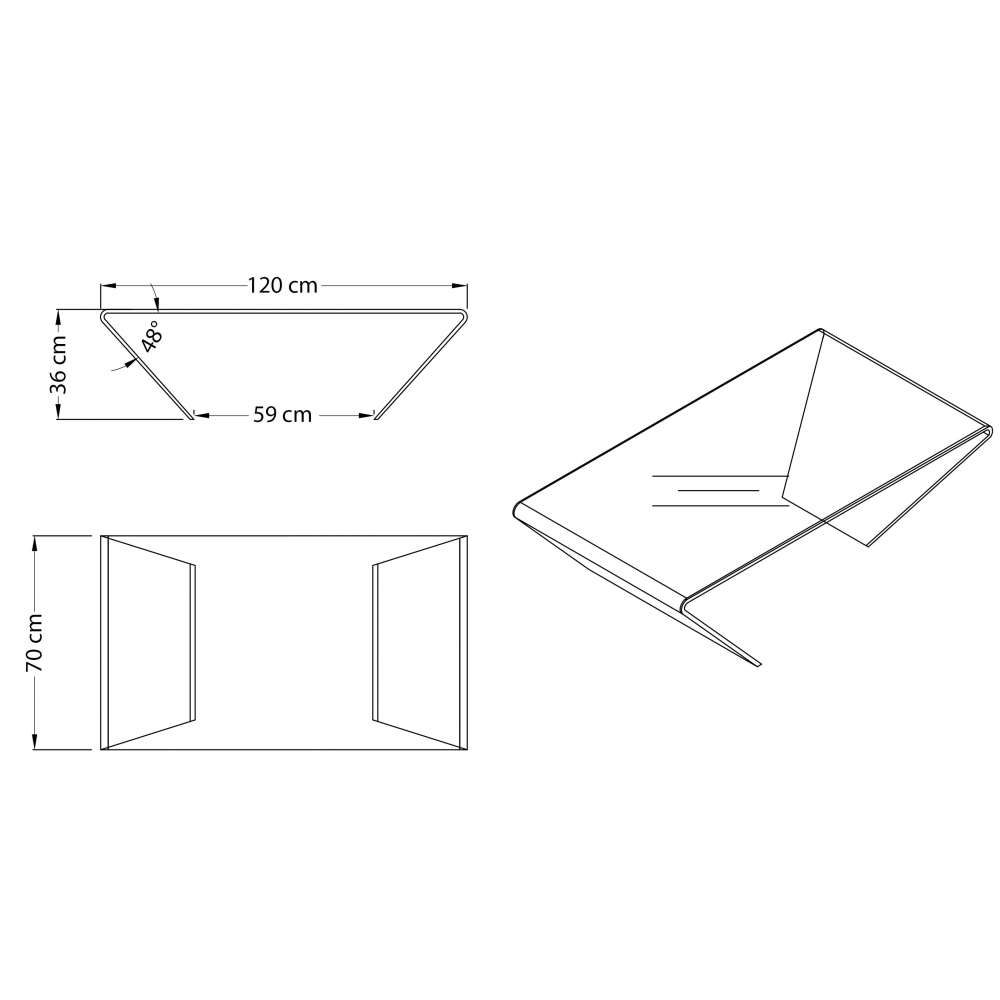 Tabela Trapezio jest wykonany z giętego szkła, pod kątem 48 stopni. FLOAT fazowane szkło, szlifowane i polerowane krawędzie. Szkło o grubości 12 mm. Stół jest przezroczysty, dzięki czemu optycznie nie odbędzie. Za dodatkową opłatą istnieje możliwość polakierowania tabelę w dowolnym kolorze RAL. szkła typu: FloatWaga netto 1 P .: 30 kg Opakowanie Waga: 45 kg jednostki Max. Pojemnik: Sposób wysyłki 1: Paleta kombinacja produkt Tak