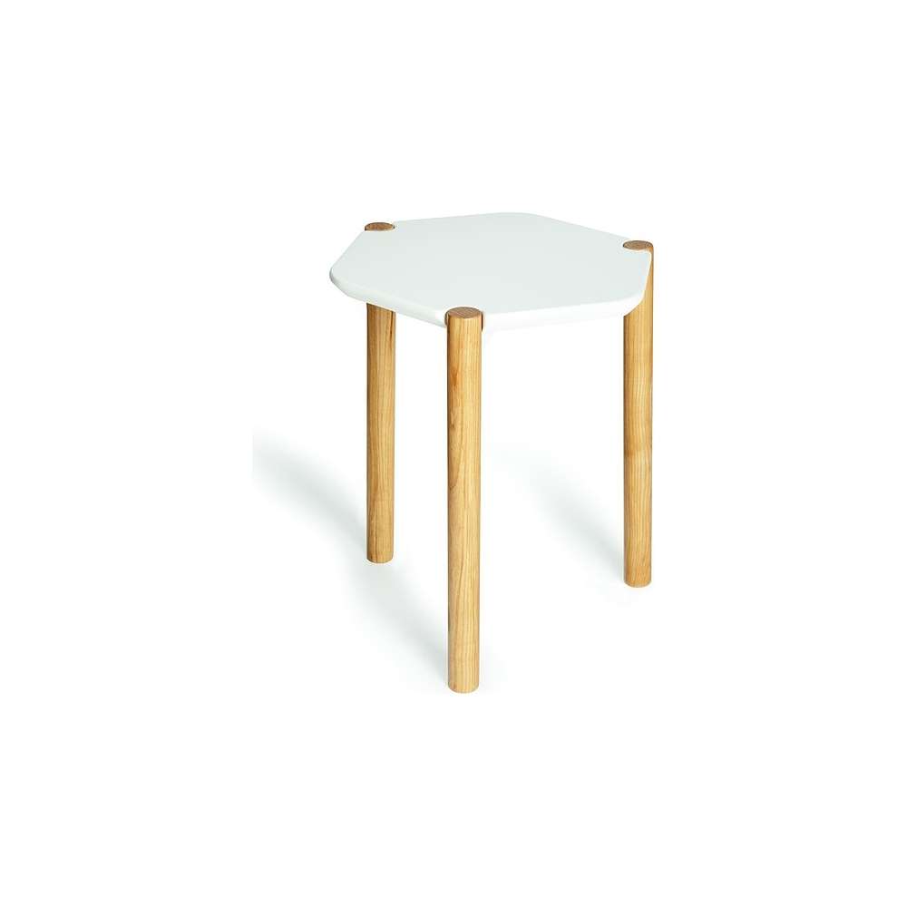 Drewniany stolik w kształcie sześciokąta. To może stanąć na własnych lub z zestawem trzech lub więcej, przy czym krawędzie wyrównane stworzyć geometryczne centralne miejsce dla swojej przestrzeni życiowej.