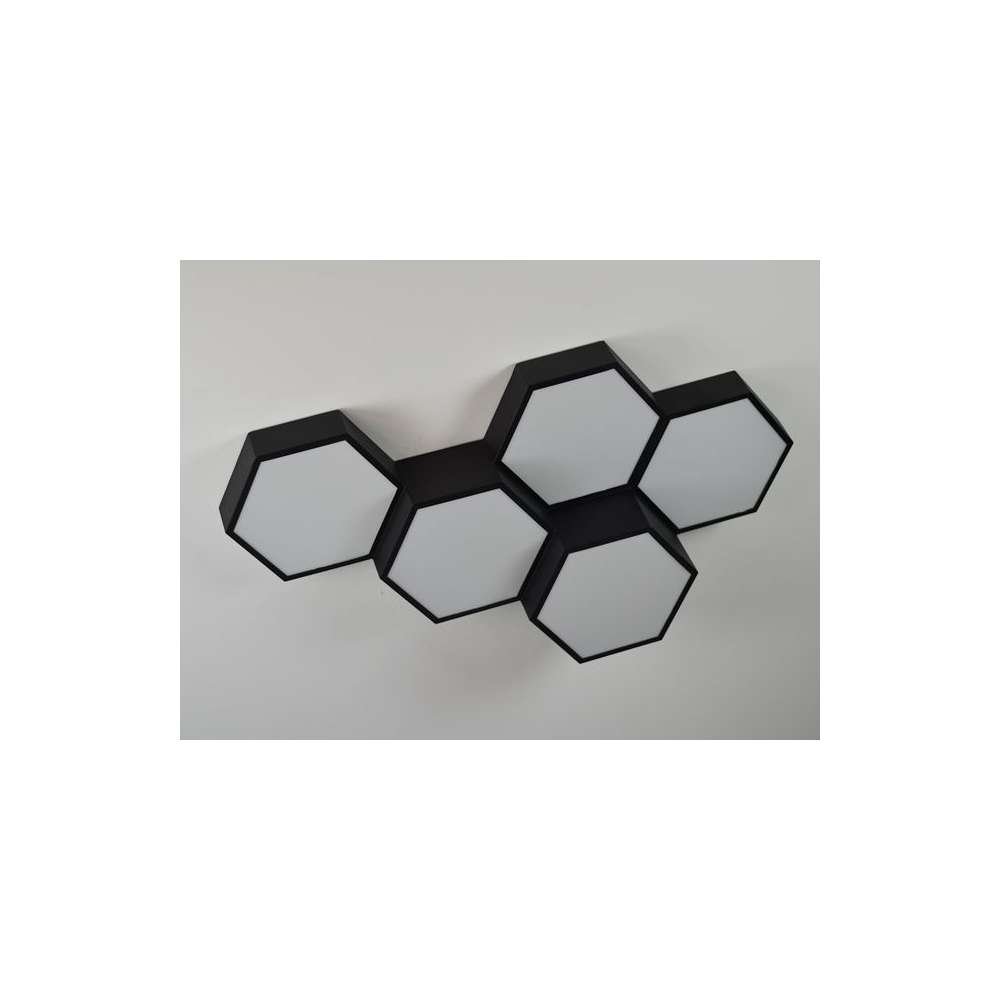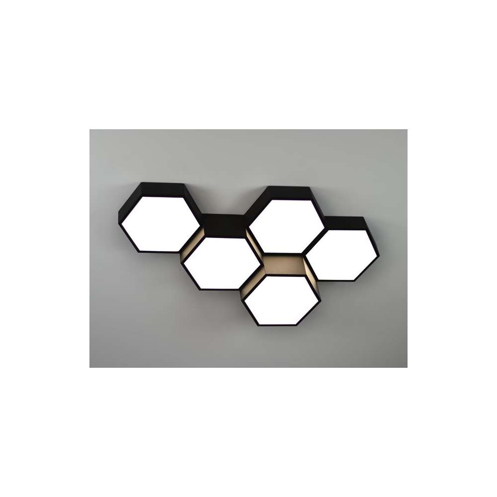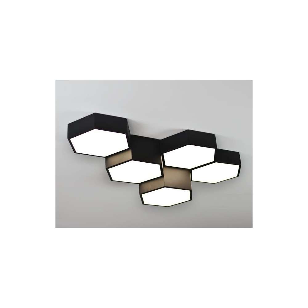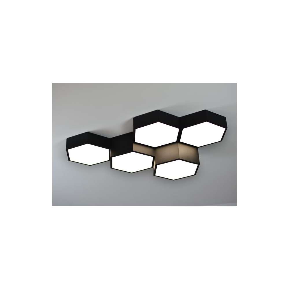 Ultranowoczesnego i oryginalne sufit LED Favo 5 sześciokątnych wykonane z dużą mocą 60W światła LED w kolorze czarnym. Sufit z możliwością zmiany barwy światła w lampie i ściemniacza funkcji. Wszystkie inne funkcje są sterowane dostarczonego lampy zdalnego sterowania.