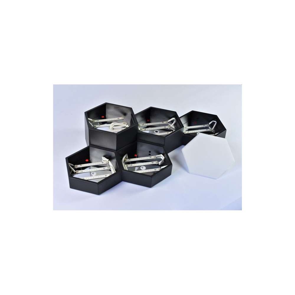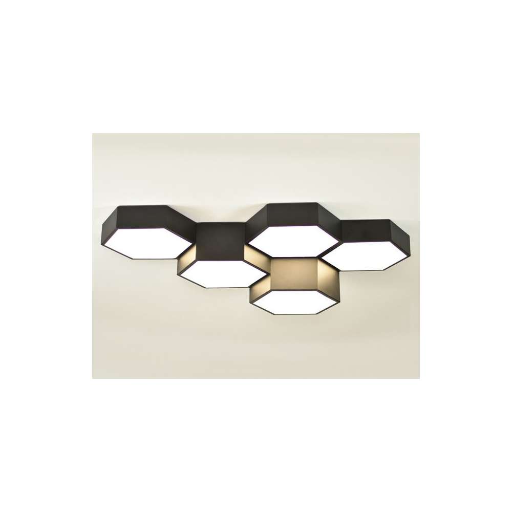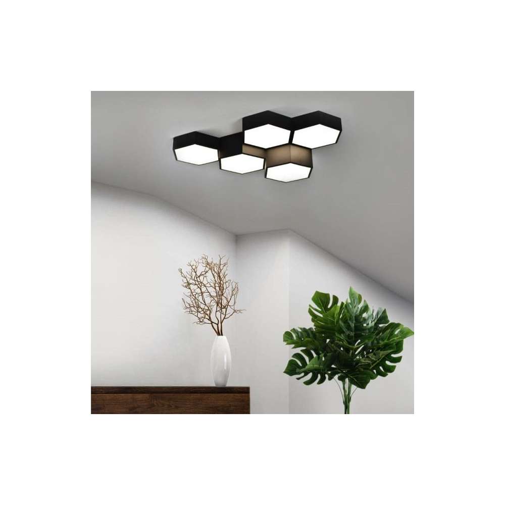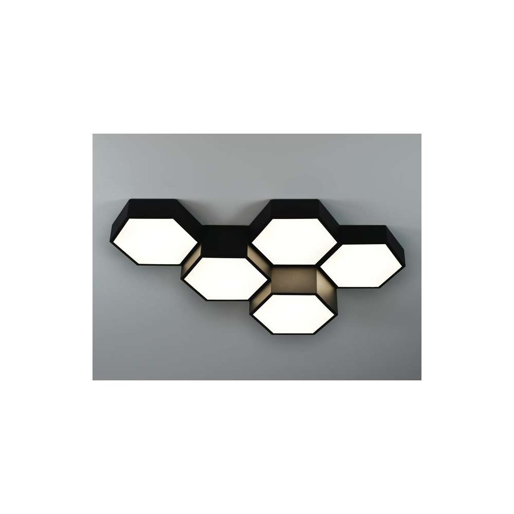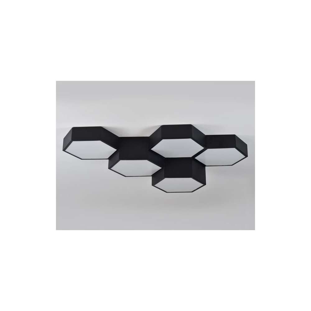 Ultranowoczesnego i oryginalne sufit LED Favo 5 sześciokątnych wykonane z dużą mocą 60W światła LED w kolorze czarnym. Sufit z możliwością zmiany barwy światła w lampie i ściemniacza funkcji. Wszystkie inne funkcje są sterowane dostarczonego lampy zdalnego sterowania.