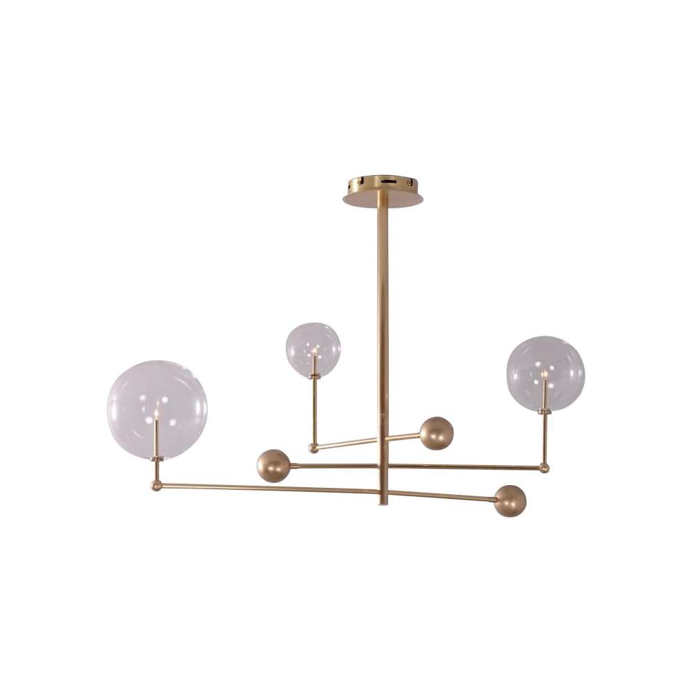 Duże nowoczesne świecznik przypominający planetarnej typ systemu: promień Żyrandol Max (odległość od osi rury): 65 cm wysokość: 90 cm 3 soczewki 16 cm, 18 cm, 20c mm Materiał: metal, szkło Kolor pozłacana źródło światła 3 x G4 żarówki (220) (żarówka włączone) gniazda G4 źródła światła