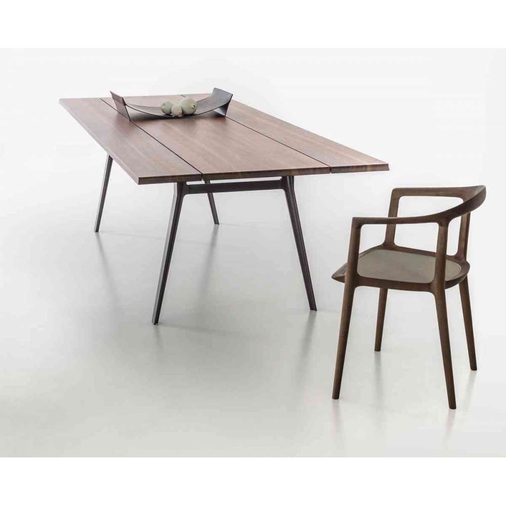 Uderzająca cecha tego modelu: dwa śmiałe podłużne rowki wzdłuż trzyczęściowego blatu stołu. Oprócz usłojenia podkreślają długość. Podwójne nogi, wpuszczone do środka, wykonane z odlewanego aluminium lakierowanego na kolor, zapewniają doskonałą stabilność pomimo lekkiego, pełnego wdzięku wyglądu. Linie i położenie podstawy są bezpośrednio związane ze sposobem podziału blatu. W ten sposób blat i rama tworzą jedną wizualną całość.