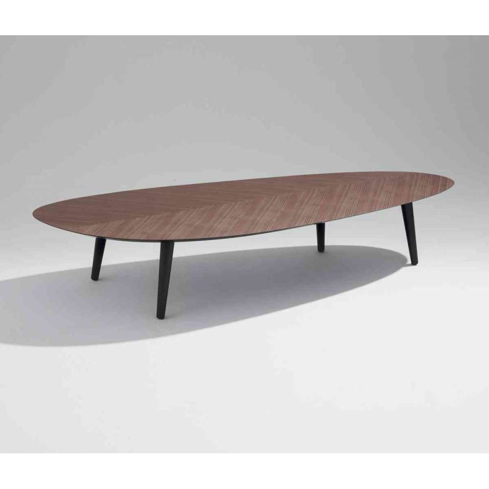 blat o grubości 30 mm dostępny w naturalnym fornirze dębowym malowanym lub malowanym na czarno z otwartymi porami lub w fornirze orzechowym Canaletto. Podstawa malowana na czarno. Nogi z rur ze stali nierdzewnej, pomalowane na czarny mat.