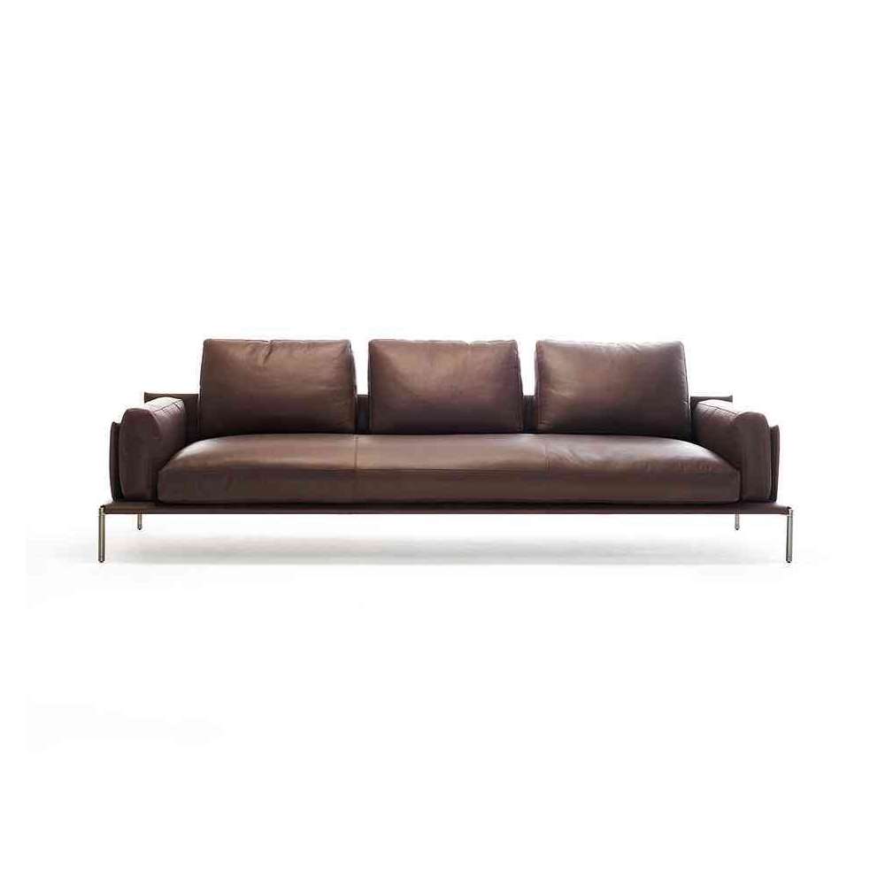 Stalowe nóżki, z błyszczącym czarnym wykończeniem niklowo-satynowym lub lakierowanym grafitem. Stalowa rama. Jednoczęściowa poduszka siedziska ze stopniowanego poliuretanu/regenerowanego i nadającego się do regeneracji płatków poliestrowych. Poduszka oparcia w 100% nowych gęsich pierzach. Poduszka podłokietnika z regenerowanych i nadających się do regeneracji płatków poliestrowych. Zdejmowane pokrycie z tkaniny lub skóry. Panele boczne pokryte są tą samą tkaniną lub skórą co poduszki. Proste i zakrzywione sofy końcowe mogą być wyposażone w poduszkę podłokietnika lub tacę wykonaną z litego jesionu pomalowanego na czarny mat z otwartymi porami, umieszczoną na podstawie nośnej sofy.
