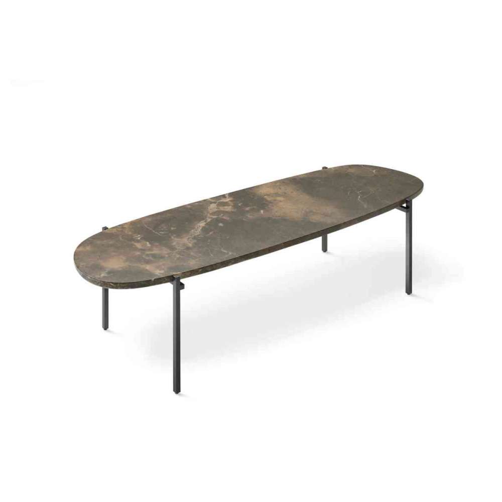 Formy natury i procesy, które zachodzą bez udziału człowieka: na przykład skała rzeczna pękła na dwie części, której górna strona została wygładzona przez wodę i czas, podczas gdy dolna strona zachowała swoją krzywiznę. Następnie projektant interweniował w proporcjach, podkreślając jego długość, tworząc okazjonalny stół, który może uzupełnić część wypoczynkową lub salon. Płyty z marmuru Carrara, Marquinia lub Emperador są nieprzezroczyste, ciepłe i przyjemne w dotyku, wsparte po prostu na minimalistycznej metalowej podstawie w kolorze czarnym lub białym. wykorzystaj ponadczasowe właściwości marmurowej płyty, aby stworzyć powierzchnie, które łączą i uzupełniają środowiska do rozmów i miejsc do siedzenia. Płyta, osadzona na minimalistycznej konstrukcji, ma formę przywodzącą na myśl przełamany na pół rzeczny kamyk, z płaskim wierzchołkiem i podstawą o delikatnej krzywiźnie.”