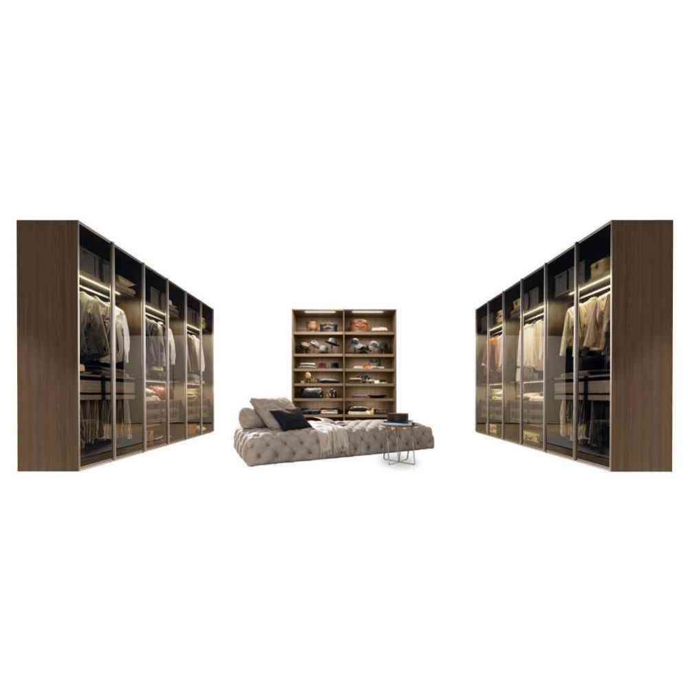 System Combi: szafa w termostrukturze olmo cortex NT z drzwiami na zawiasach Teca z przezroczystego szkła fumé z aluminiową ramą wykończoną tytanem.