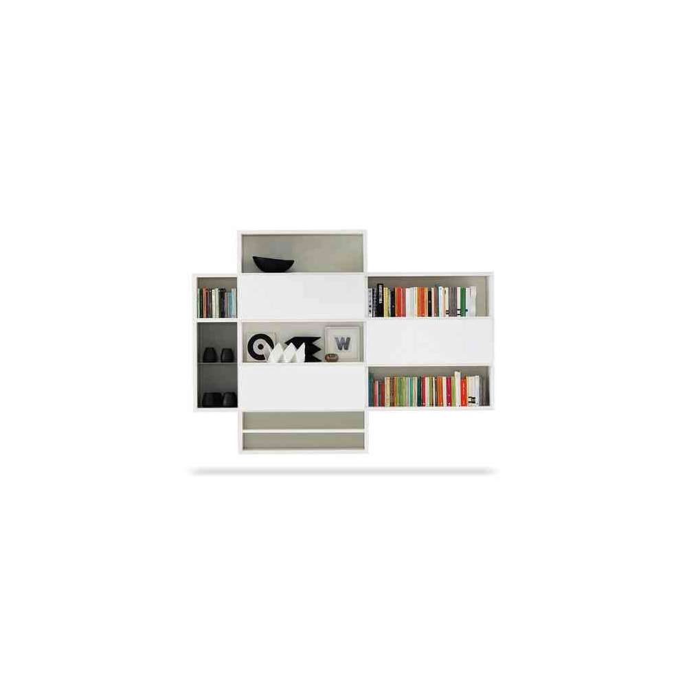 Jasny salon i „total white” z regałami wiszącymi Link System, melamina termostrukturalna dąb z otwartymi porami w kolorze białym, drzwi przesuwne z białego lakierowanego szkła matowego. W połączeniu z sofą Freemood i fotelami It-is firmy Désirée.