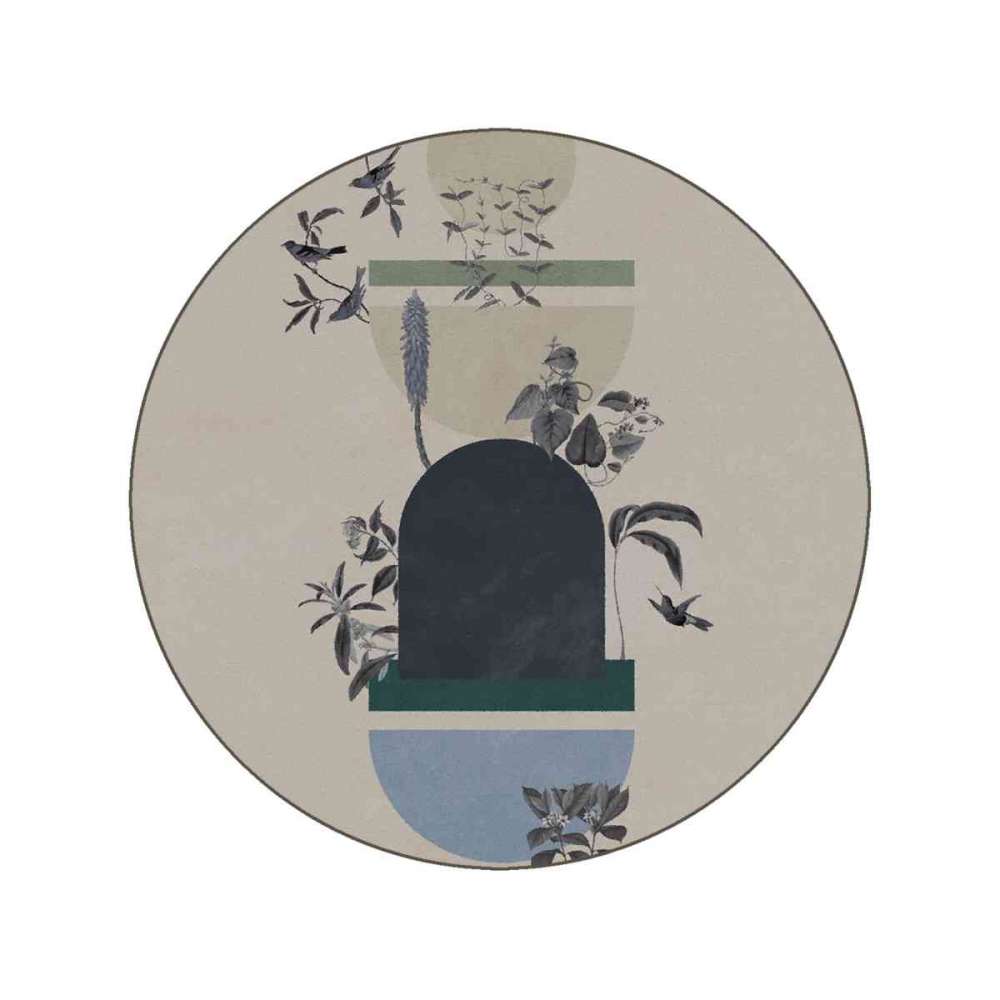 Dywan przedstawia wyimaginowany krajobraz, w którym natura bawi się geometrycznymi kształtami. Niektóre ptaki przelatują przez ten tajemniczy krajobraz. Równoważąc realizm z abstrakcją, ta seria 3 kolorów łączy drobiazgowe szczegóły botaniczne z swobodnymi formami geometrycznymi.