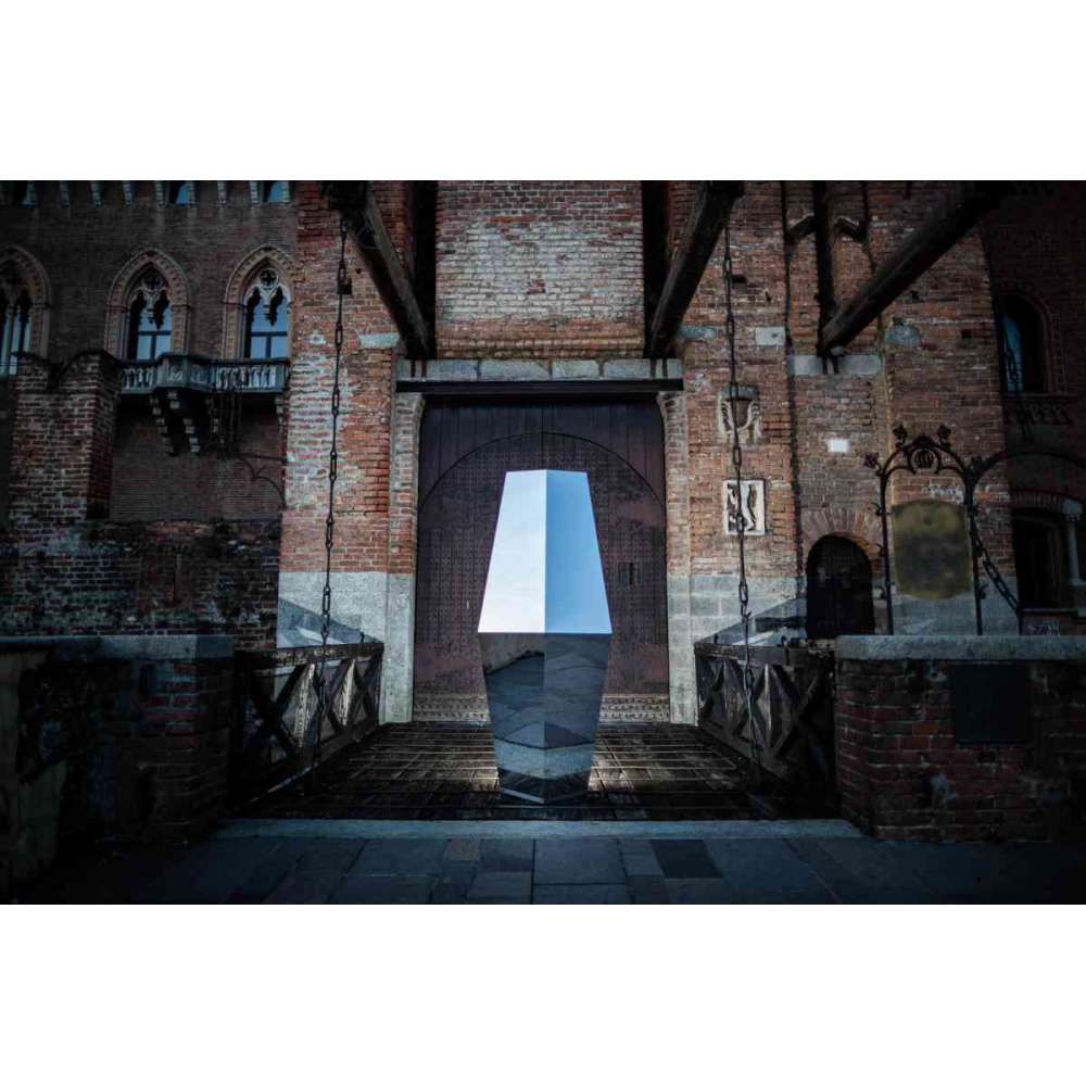 Monolit z polerowanej stali nierdzewnej w kształcie graniastosłupa. Szlachetne materiały i wyrafinowane wykończenia pozostawiają niezatarte wrażenie w pamięci.