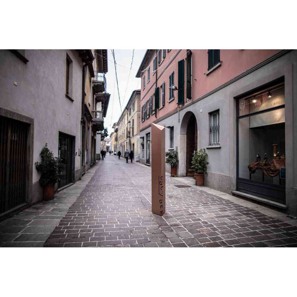 Monolit w wykończeniu szczotkowanej miedzi, w kształcie graniastosłupa z trójkątną podstawą. Kolekcja YDF CUSTOM MONOLITH nadaje się do niestandardowego projektowania w celu tworzenia ekskluzywnych elementów. Monolity mogą być personalizowane pod względem projektu, wymiarów, wykończenia, a ponadto poprzez osobiste dedykacje.