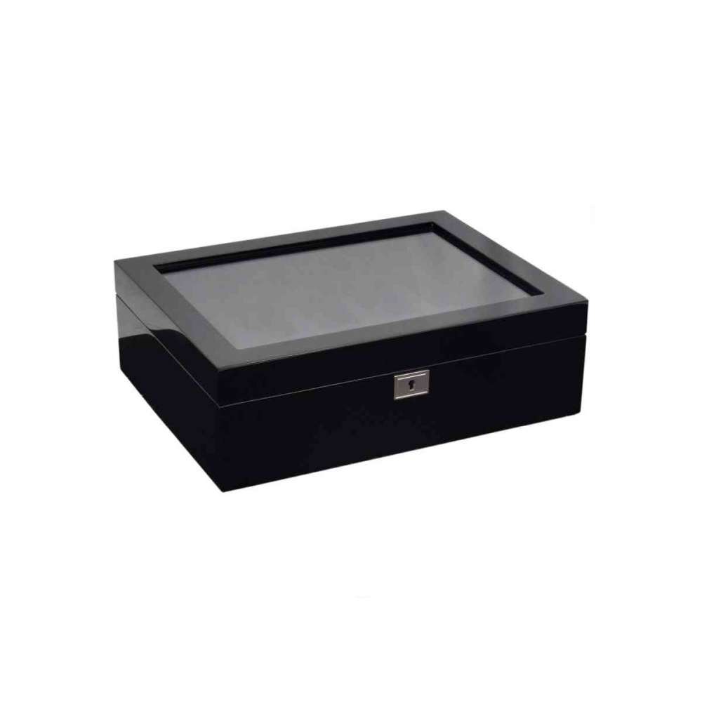 Przystań dżentelmenów i bezpieczna przystań zegarków. Prezentuj i organizuj swoje zegarki z klasą. 10-częściowe pudełko na zegarek Savoy ma dziesięciokrotnie ręcznie polerowaną obudowę z czarnego drewna, czarną teksturowaną jedwabną wyściółkę, zamykaną szklaną pokrywę i chromowane elementy, odpowiednie dla angielskich dżentelmenów lub światowych machnięć.