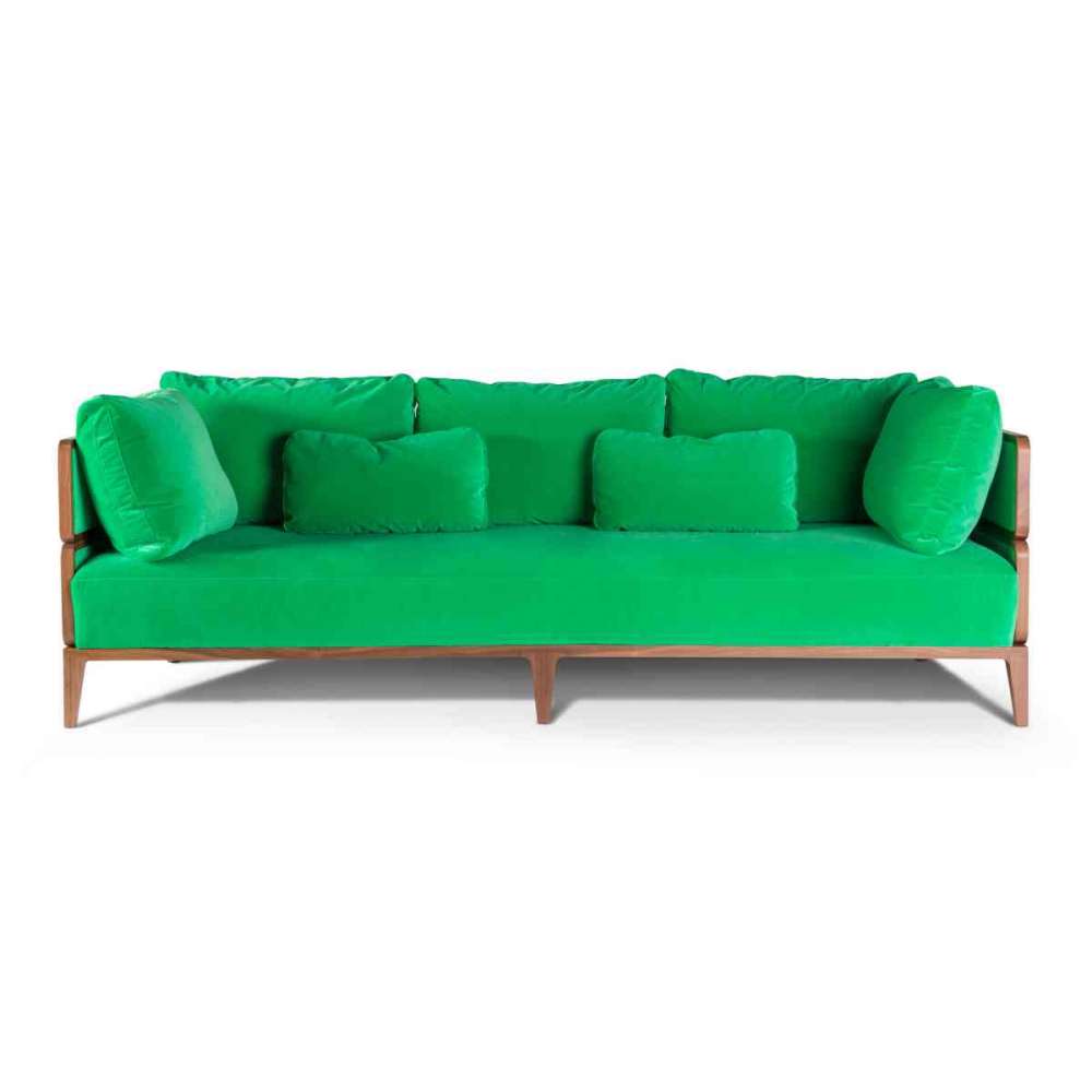 Modułowy i wyjmowany system siedzeń. Struktura z kwadratowymi konturami orzecha włoskiego Canaletto i panelami pokrytymi tkaniną. Pokrycie dostępne z plecionej trzciny dla górnego zakresu. Siedzisko i poduszki wypełnione pianką poliuretanową o różnej gęstości oraz gęsim pierzem lub poliestrem. Wysokość 84
