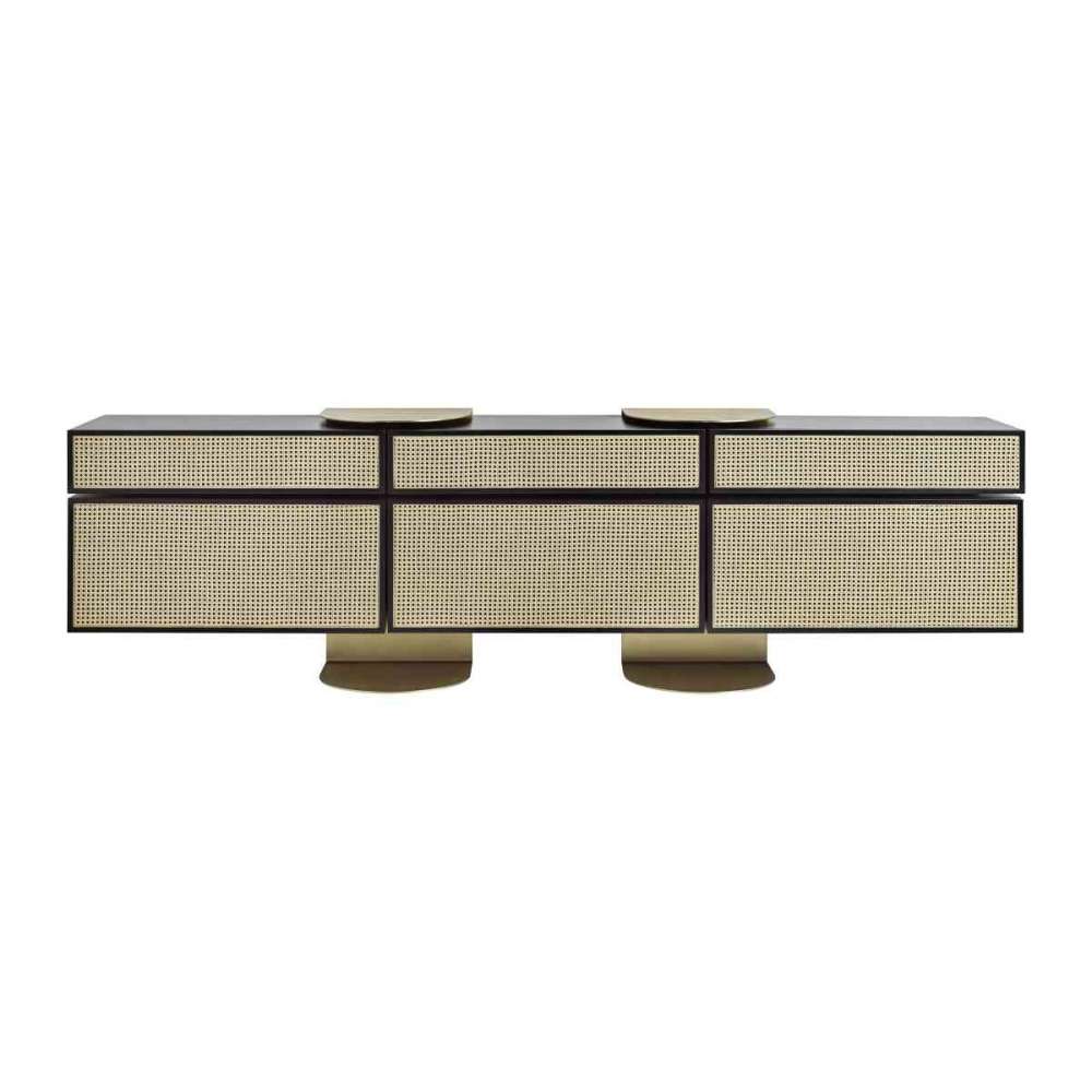 Szafka składająca się z sześciu modułów z lakierowanego drewna z elementami dekoracyjnymi z plecionej trzciny. Moduły są zawieszone dzięki metalowej konstrukcji z satynowym wykończeniem mosiężnym, którą można przymocować do ściany.